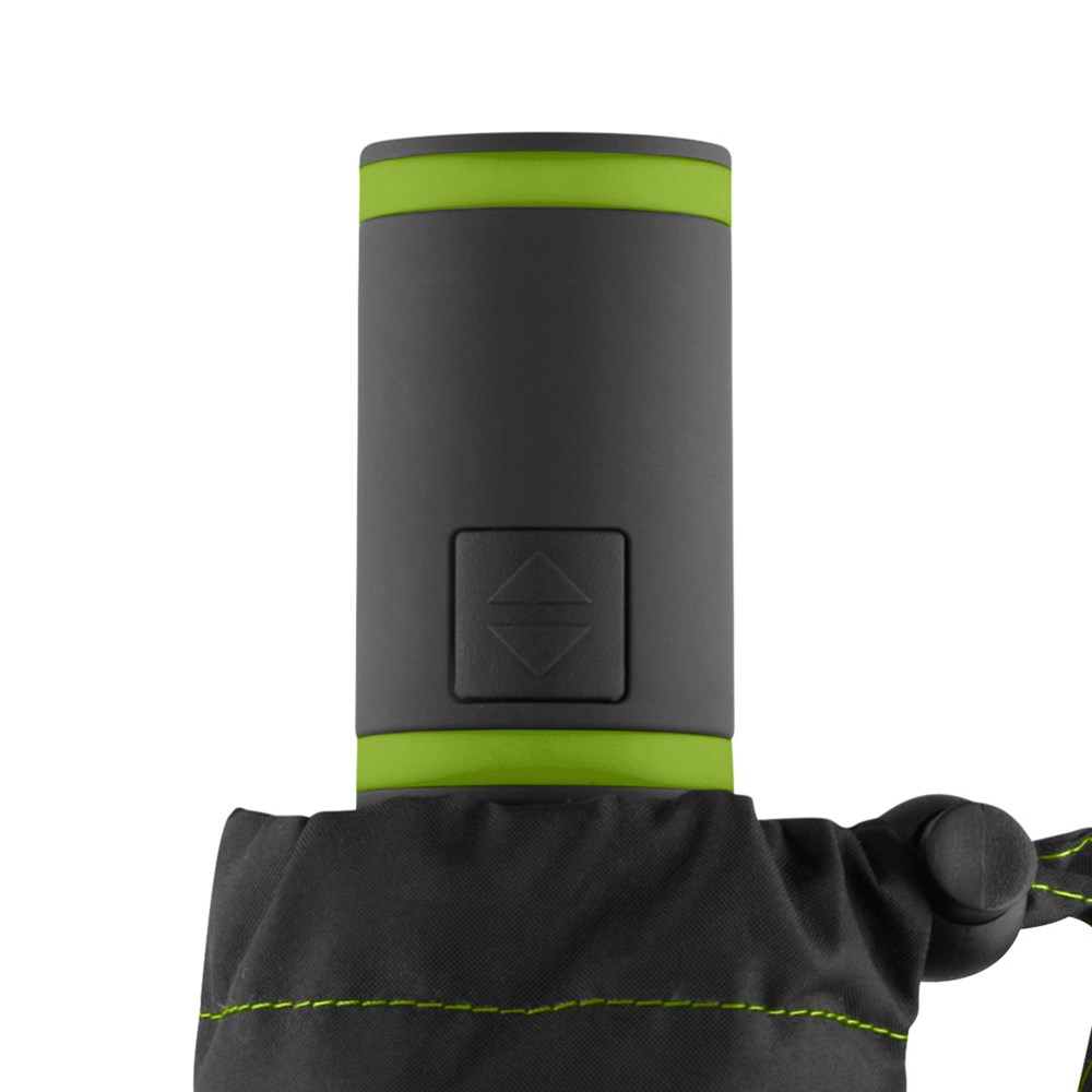 Stylish automatic open/close mini pocket umbrella with coloured elements Convenient automatic open/close function for quick opening and closing, high-quality Windproof PLUS system for maximum frame flexibility in stormy conditions, flexible fibreglass ribs, polyester pongee material made of recycled plastics, eco-friendly thanks to original waterSAVE cover material made of recycled plastics, with waterSAVE® label on the closing strap, attractive design thanks to coloured ribs, handle rings and seams, comfortable Soft-Feel handle with integrated push-button and promotional labelling option, convenient case with coloured seams and carrying straps. Also available as mini umbrella (art. 5084, 5584), midsize umbrella (art. 4784) and golf umbrella (art. 2384).