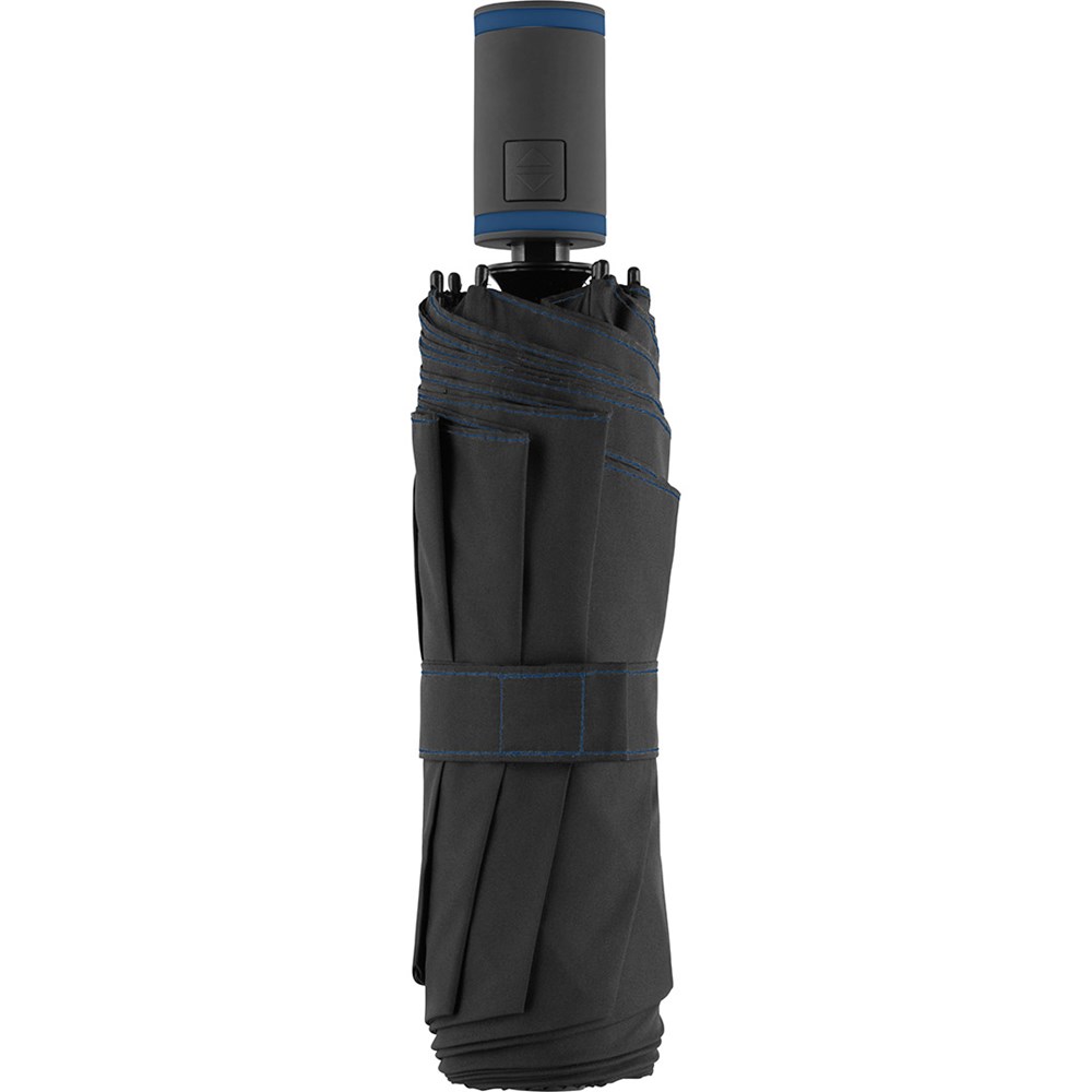 Stylish automatic open/close mini pocket umbrella with coloured elements Convenient automatic open/close function for quick opening and closing, high-quality Windproof PLUS system for maximum frame flexibility in stormy conditions, flexible fibreglass ribs, polyester pongee material made of recycled plastics, eco-friendly thanks to original waterSAVE cover material made of recycled plastics, with waterSAVE® label on the closing strap, attractive design thanks to coloured ribs, handle rings and seams, comfortable Soft-Feel handle with integrated push-button and promotional labelling option, convenient case with coloured seams and carrying straps. Also available as mini umbrella (art. 5084, 5584), midsize umbrella (art. 4784) and golf umbrella (art. 2384).