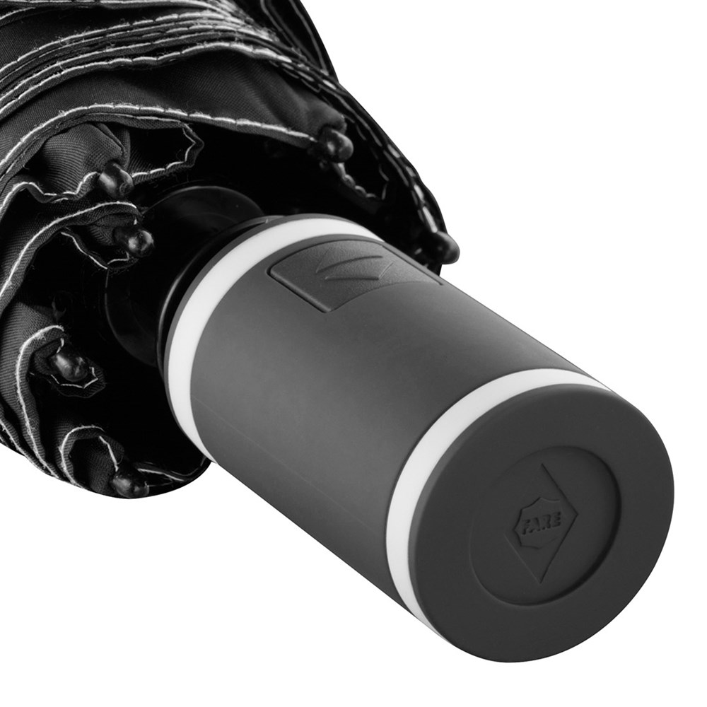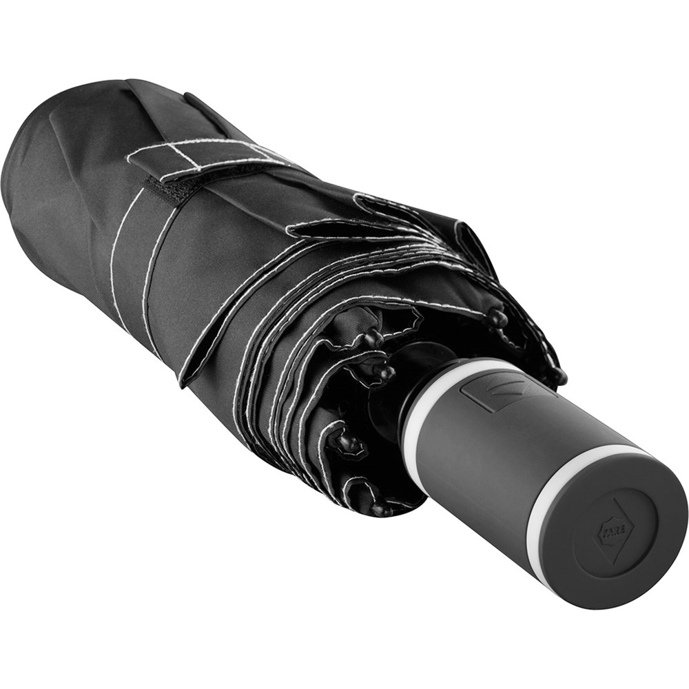 Stylish automatic open/close mini pocket umbrella with coloured elements Convenient automatic open/close function for quick opening and closing, high-quality Windproof PLUS system for maximum frame flexibility in stormy conditions, flexible fibreglass ribs, polyester pongee material made of recycled plastics, eco-friendly thanks to original waterSAVE cover material made of recycled plastics, with waterSAVE® label on the closing strap, attractive design thanks to coloured ribs, handle rings and seams, comfortable Soft-Feel handle with integrated push-button and promotional labelling option, convenient case with coloured seams and carrying straps. Also available as mini umbrella (art. 5084, 5584), midsize umbrella (art. 4784) and golf umbrella (art. 2384).