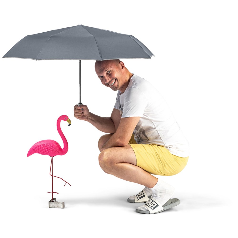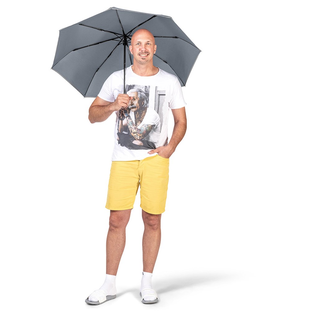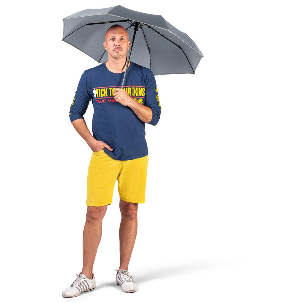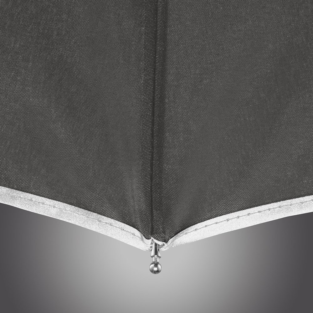 Striking automatic open/close pocket umbrella with trendy reflective piping Convenient automatic open/close function for quick opening and closing, high-quality Windproof PLUS system for maximum frame flexibility in stormy conditions, flexible fibreglass ribs, chromed steel shaft, cover with trendy reflective piping in silver, aluminium finished handle with integrated push button and promotional labelling option