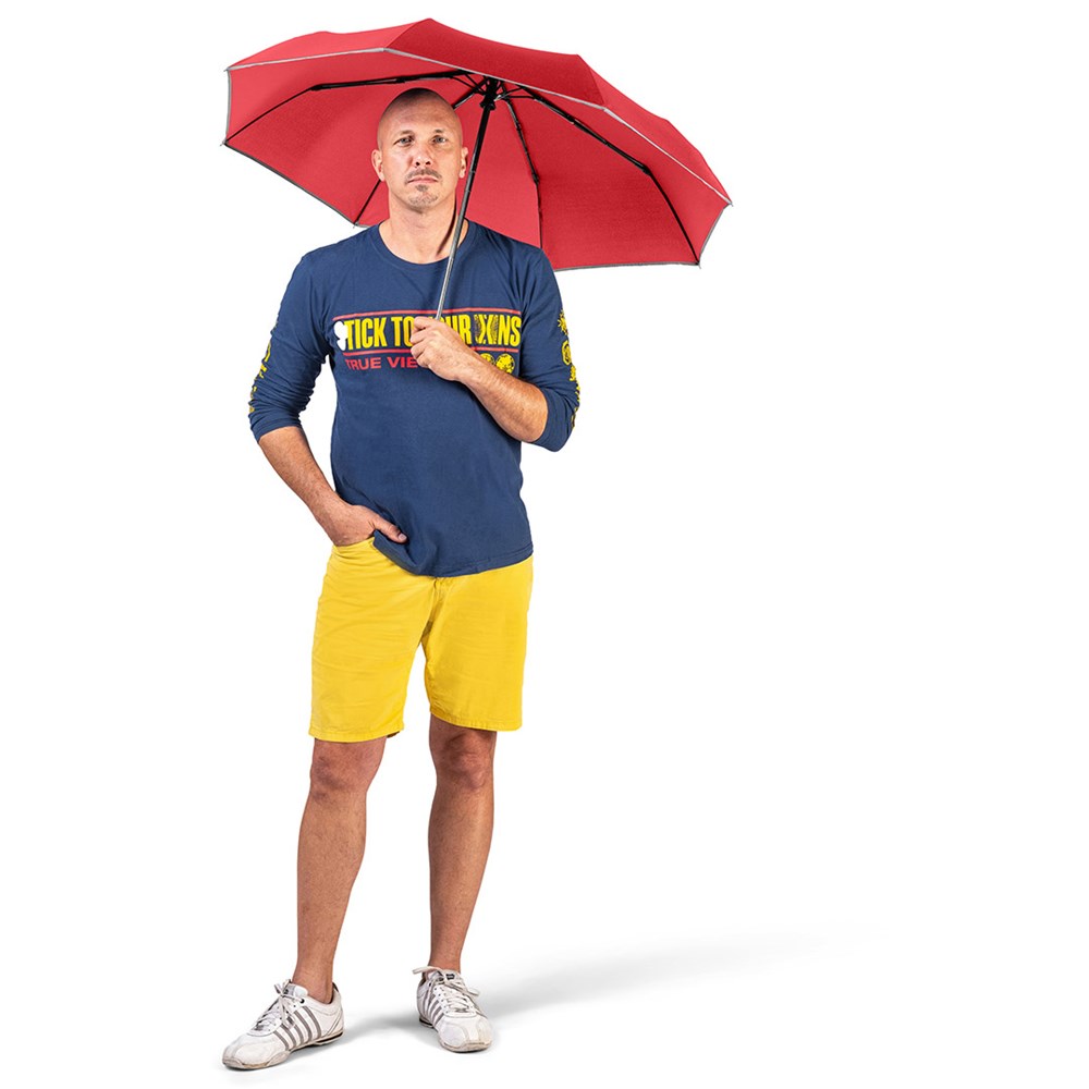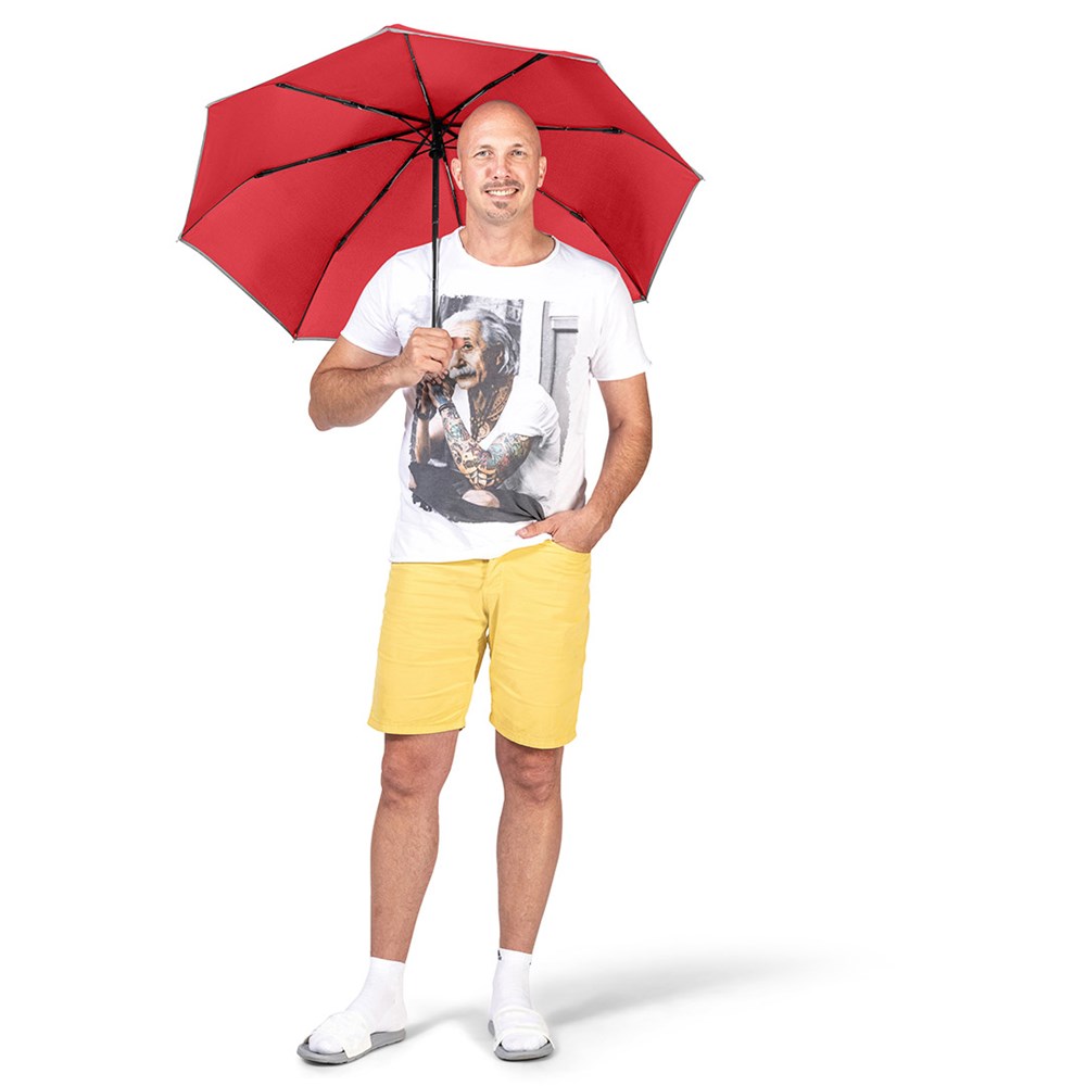 Striking automatic open/close pocket umbrella with trendy reflective piping Convenient automatic open/close function for quick opening and closing, high-quality Windproof PLUS system for maximum frame flexibility in stormy conditions, flexible fibreglass ribs, chromed steel shaft, cover with trendy reflective piping in silver, aluminium finished handle with integrated push button and promotional labelling option