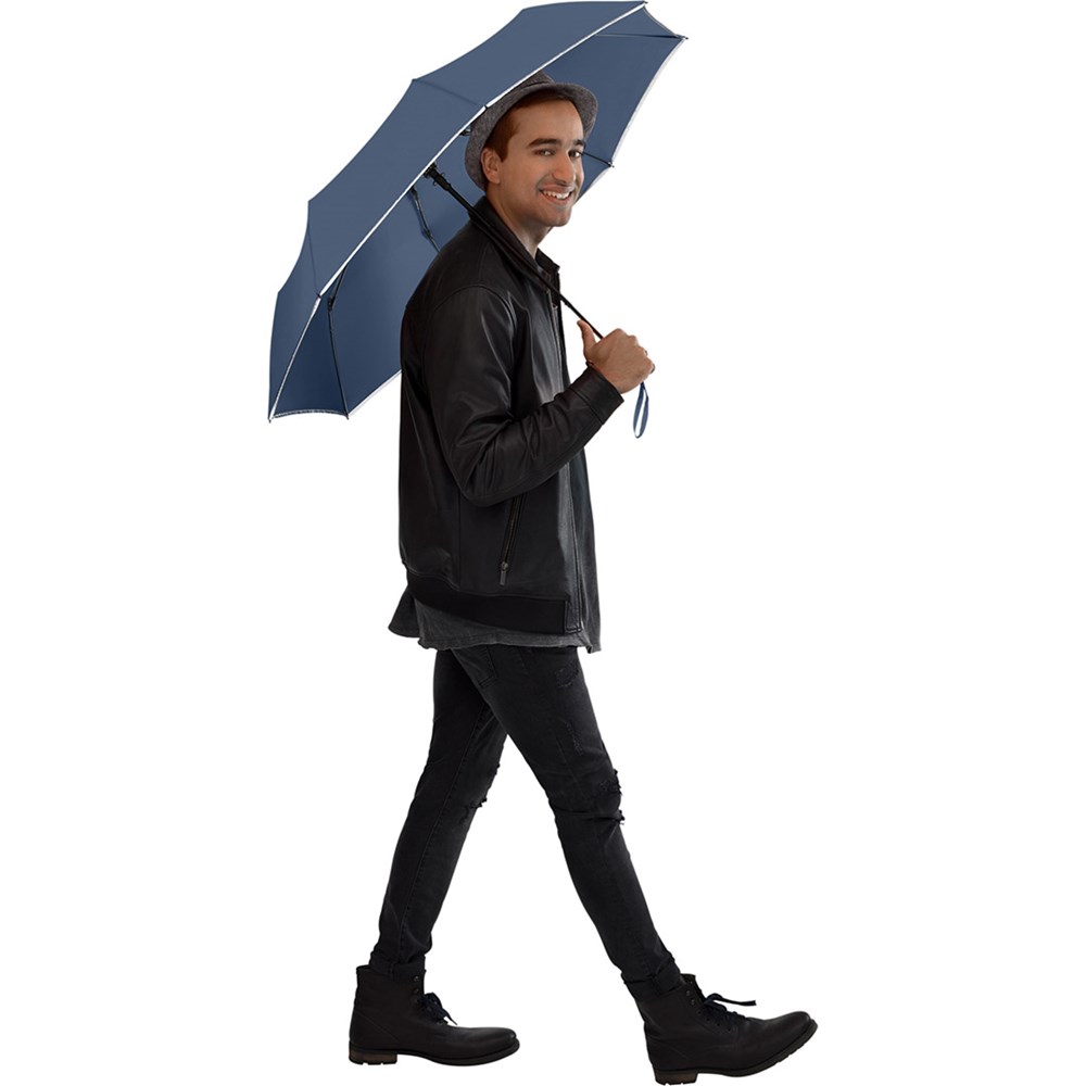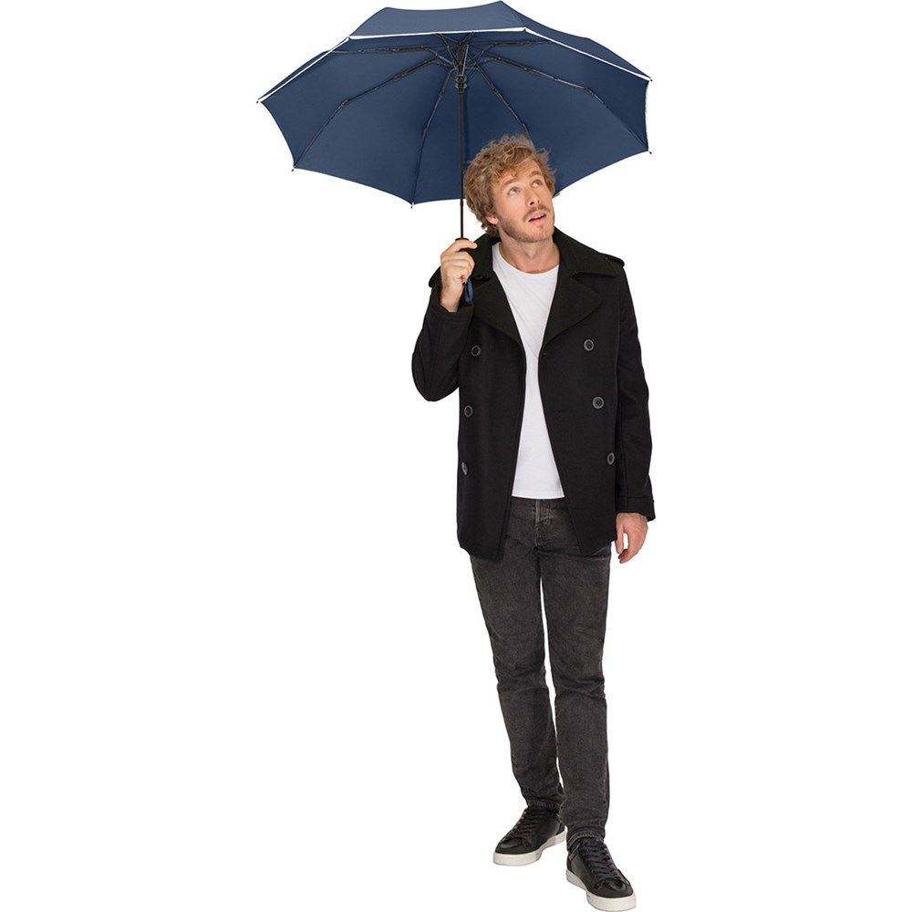 Sturdy automatic pocket umbrella with trendy reflective piping Convenient automatic function for quick opening, high-quality Windproof PLUS system for maximum frame flexibility in stormy conditions, cover with trendy reflective piping in silver, Soft-Touch handle with shiny push-button and promotional labelling option, sleeve with trendy reflective piping