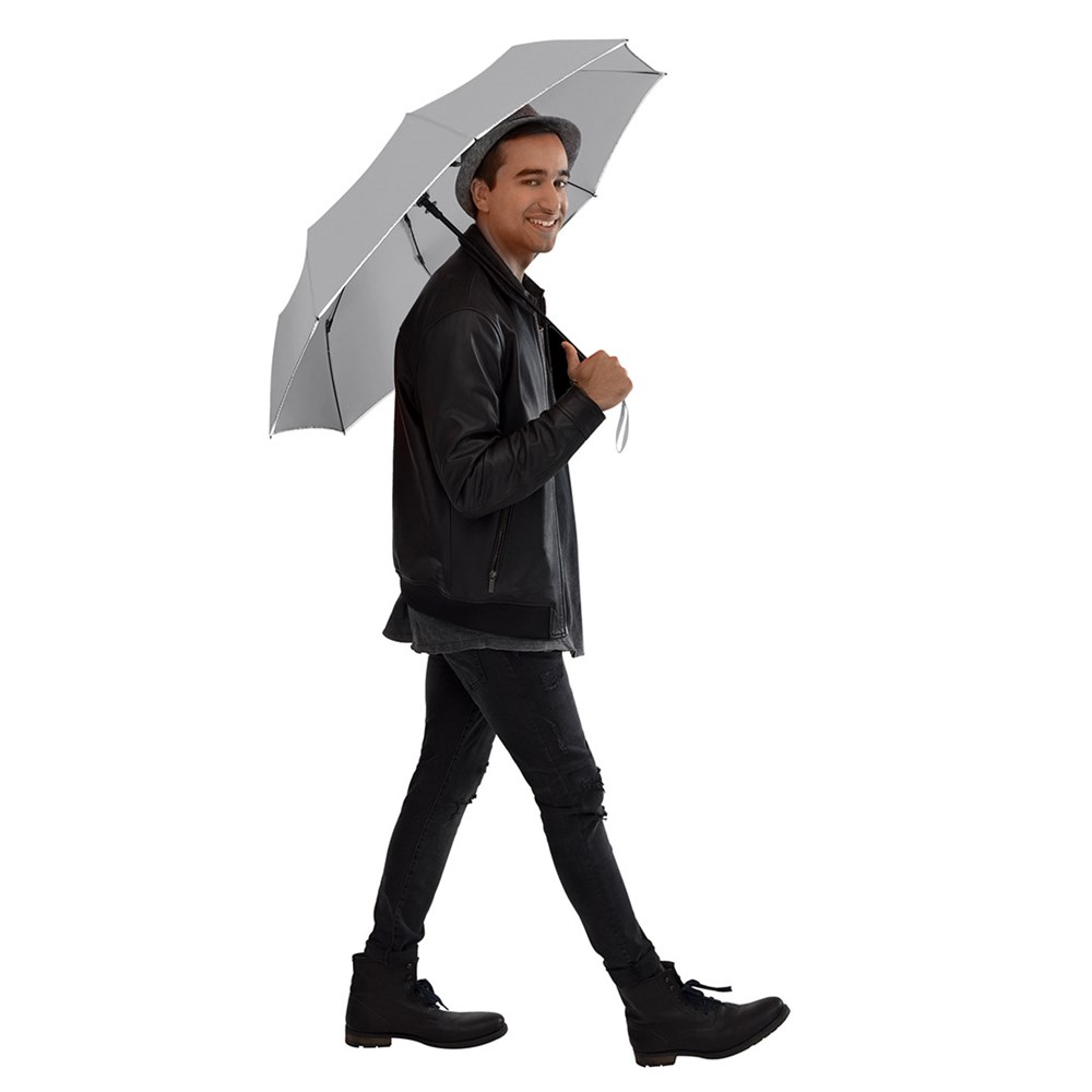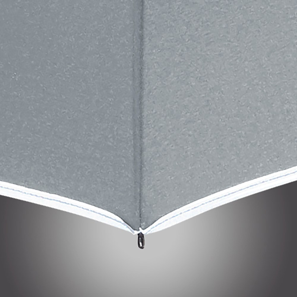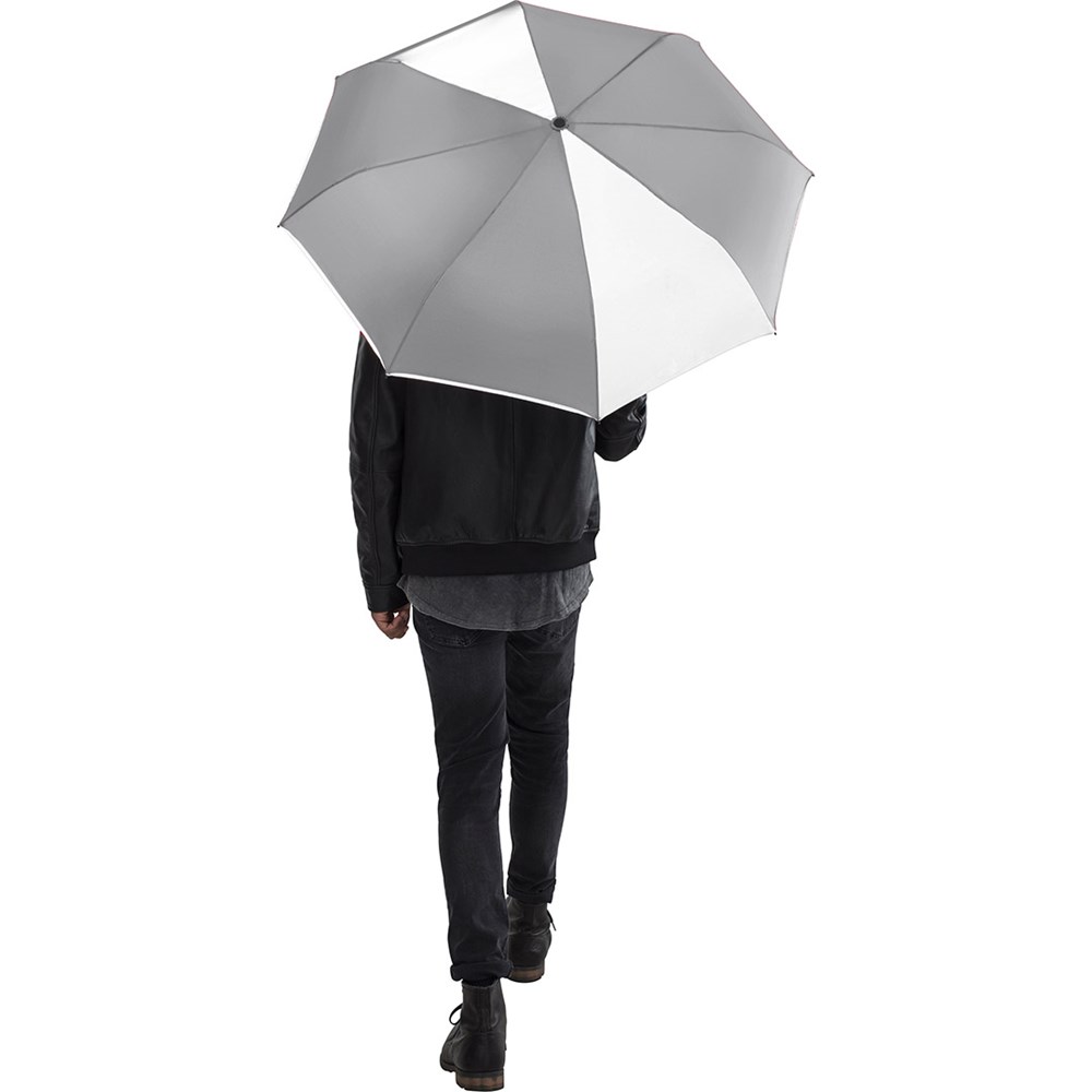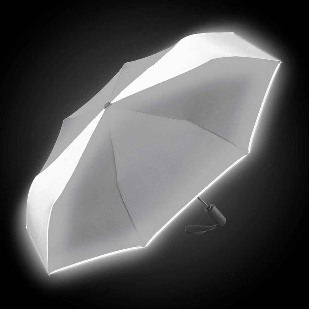Trendy automatic open/close mini pocket umbrella with trendy reflective outer coating on two panels Convenient automatic open/close function for quick opening and closing, high-quality Windproof PLUS system for maximum frame flexibilityin stormy conditions, two panels and trendy piping with colour matching cover and trendy reflective coating, Soft-Feel handle with integrated push-button and promotional labelling option, sleeve with trendy reflective piping. Also available as golf umbrella (art. 7377).