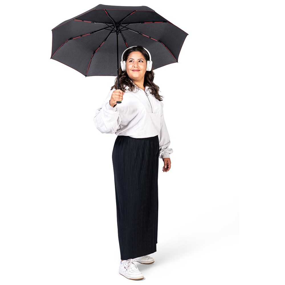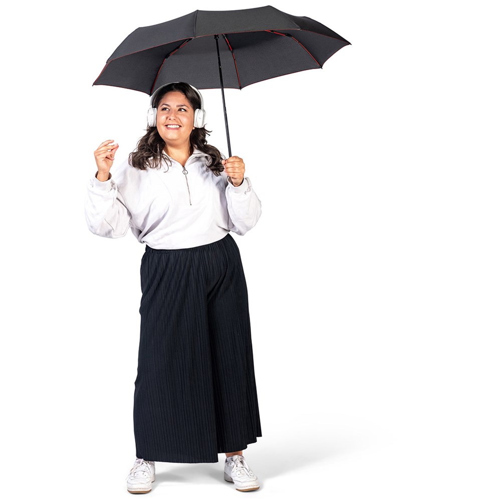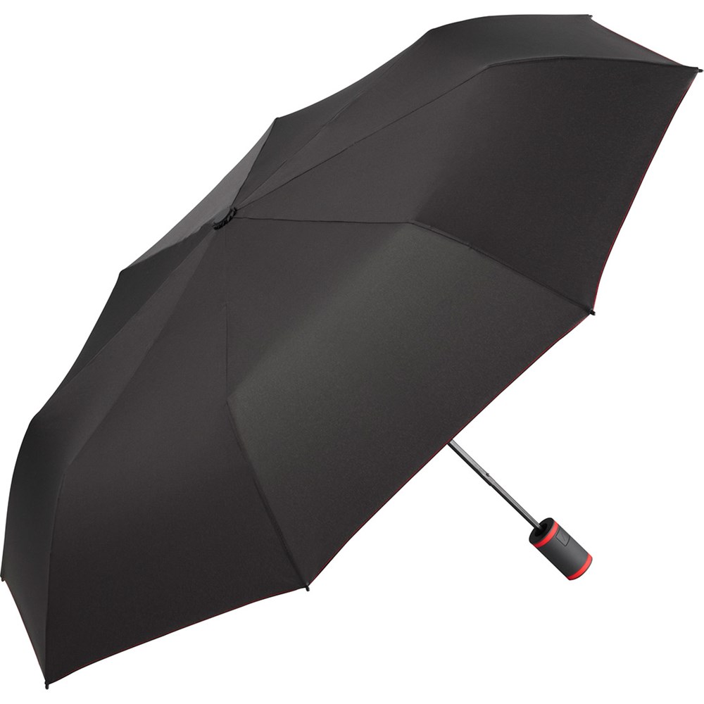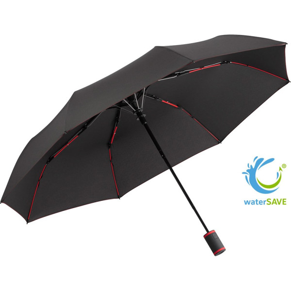 Stylish automatic mini pocket umbrella with coloured elements Convenient automatic function for quick opening, high-quality Windproof PLUS system for maximum frame flexibility in stormy conditions, flexible fibreglass ribs, polyester pongee material made of recycled plastics, eco-friendly thanks to original waterSAVE® cover material, with waterSAVE® label on the closing strap, attractive design thanks to coloured ribs, handle rings and seams, soft-feel handle with push-button and promotional labelling option, convenient carry case with coloured seams and coloured flexible drawcord. Also available as another mini umbrella (art. 5084, 5484), midsize umbrella (art. 4784) and as golf umbrella (art. 2384).
