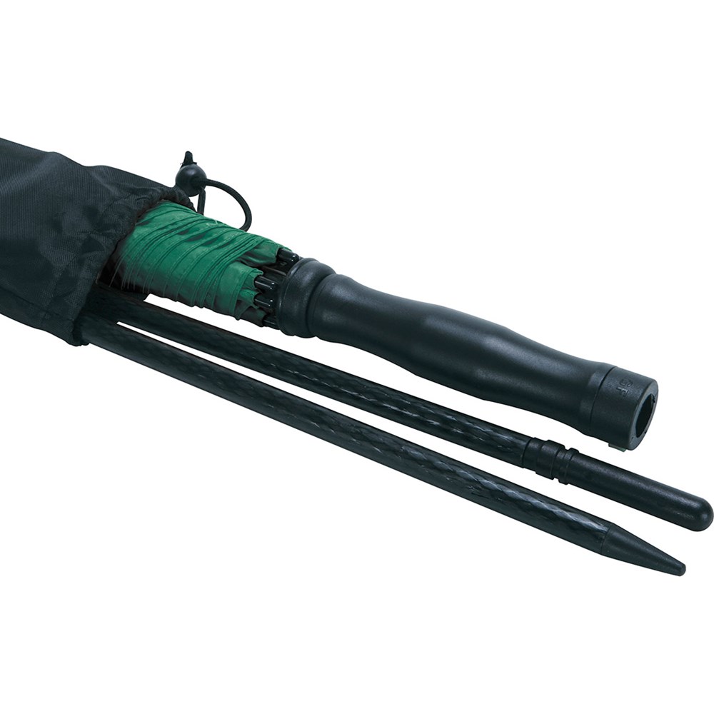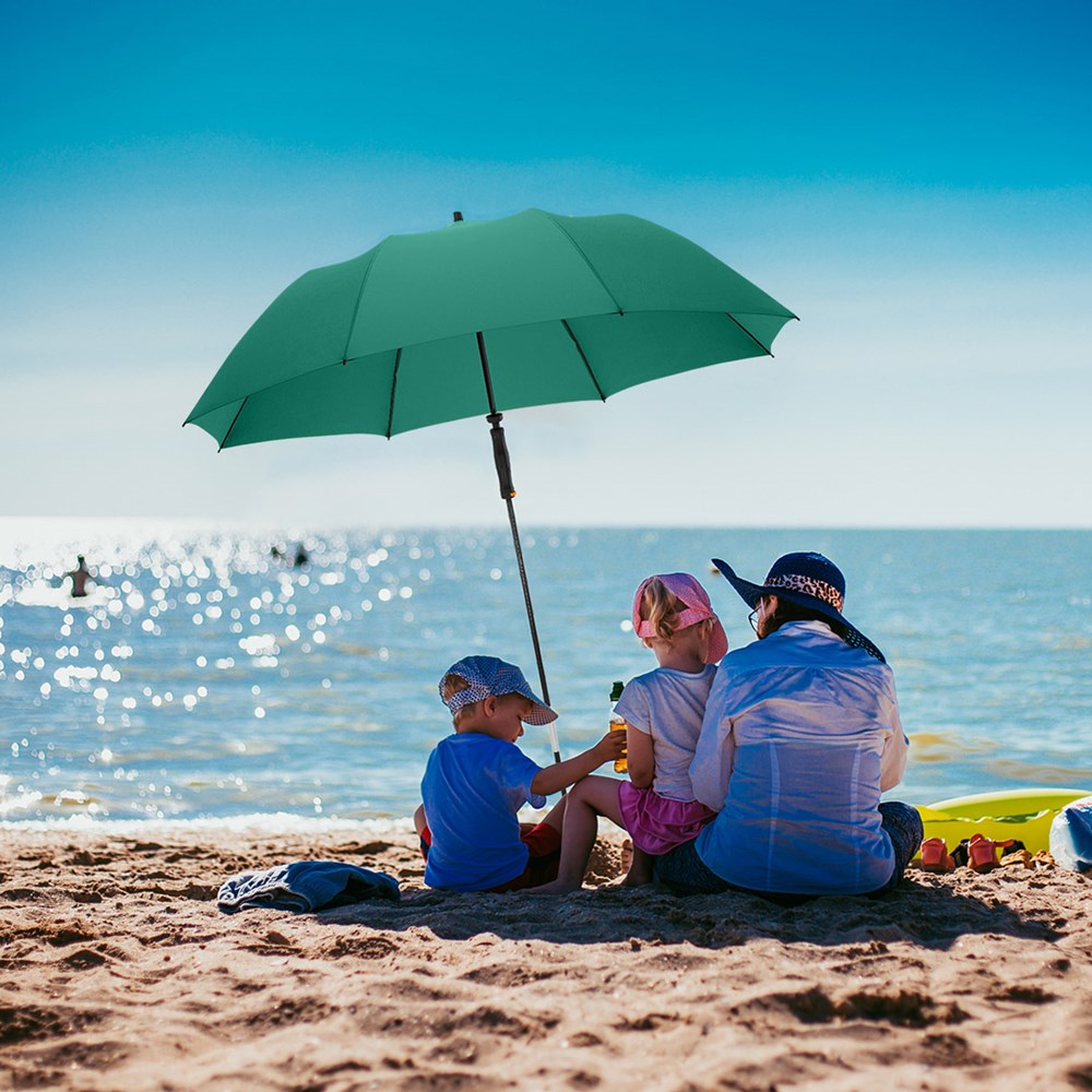 Waterproof travel parasol with UV protection 50+ Easy to handle thanks to hand friendly runner, ribs and 2-section foldable lower shaft made of sturdy fibreglass, lower shaft with tip for fixing in the ground, cover with sun protection factor UPF 50+, convenient carry case with shoulder strap and mesh, suitable for trolley suitcases, hospitable diameter, parasol also useable as umbrella, excluding ground spike (art. 8939)