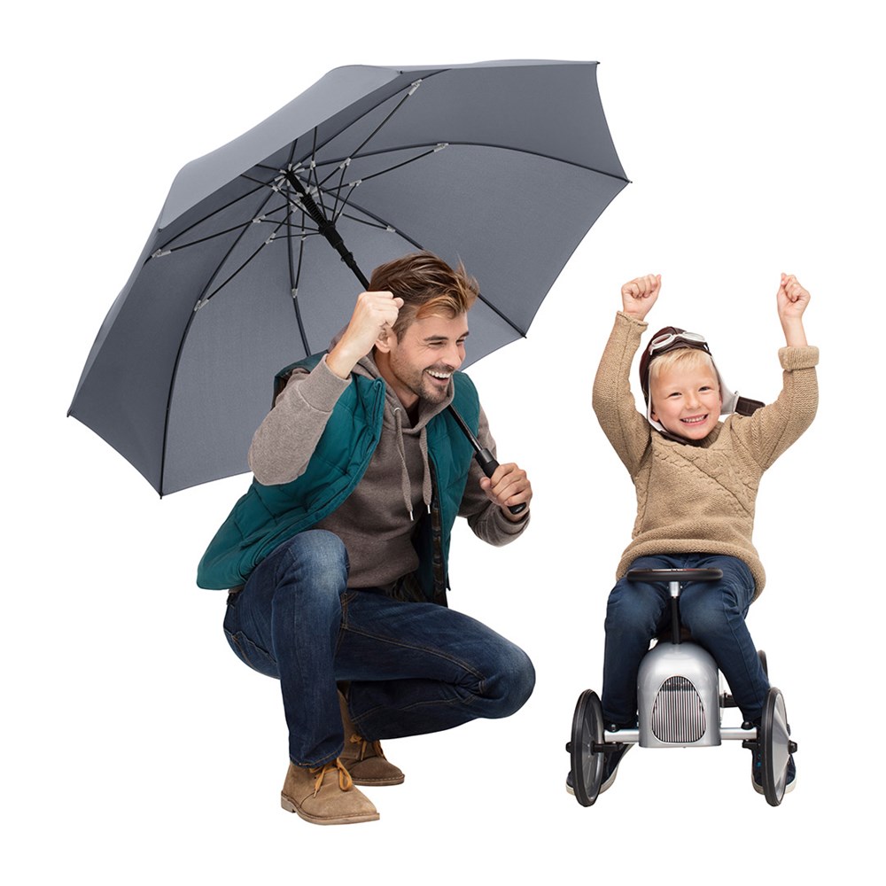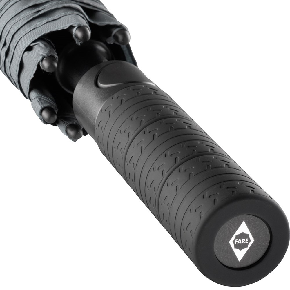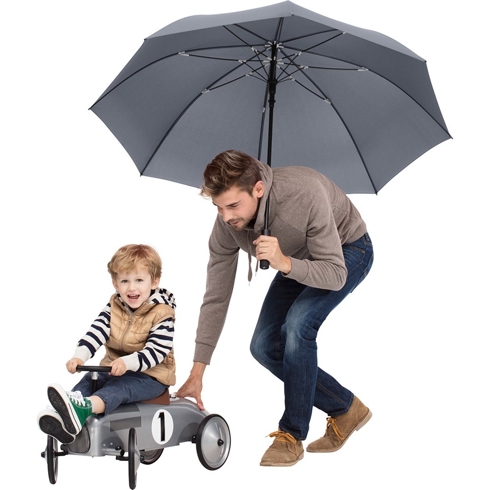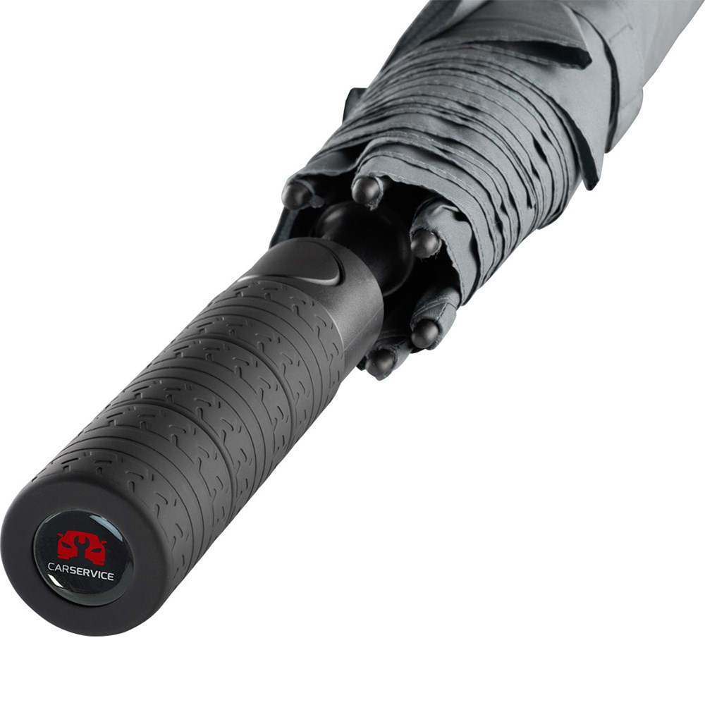 Exclusive automatic golf umbrella for two people with tyre profile design elements Convenient automatic function for quick opening, high-quality Windproof PLUS system for maximum frame flexibility in stormy conditions, flexible fibreglass ribs with grey joints, tyre profile design soft-feel handle with integrated push-button and promotional labelling option. Also available as mini umbrella (art. 5455).