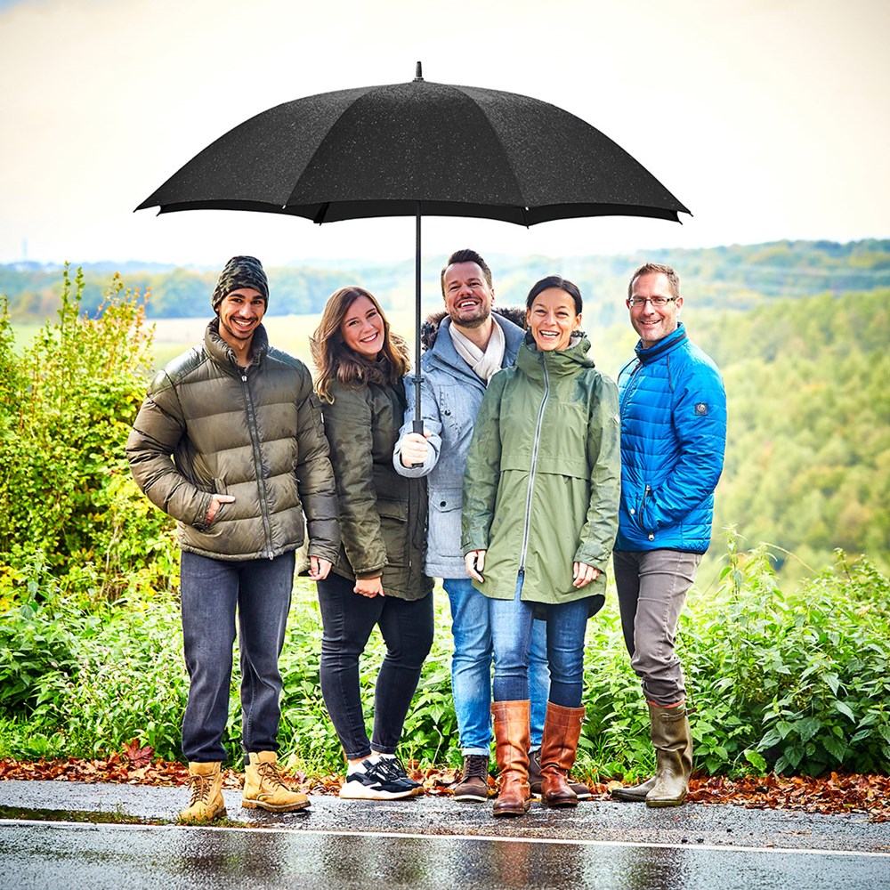 Giant doorman umbrella for up to seven people Easy to handle thanks to sliding safety runner, high-quality Windproof PLUS system for maximum frame flexibility in stormy conditions, extremely sturdy and big fibreglass shaft, sturdy fibreglass ribs, Extremely huge canopy to protect several people, comfortable soft handle and with promotional labelling option, large diameter for up to 7 people