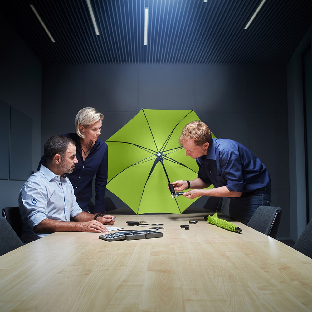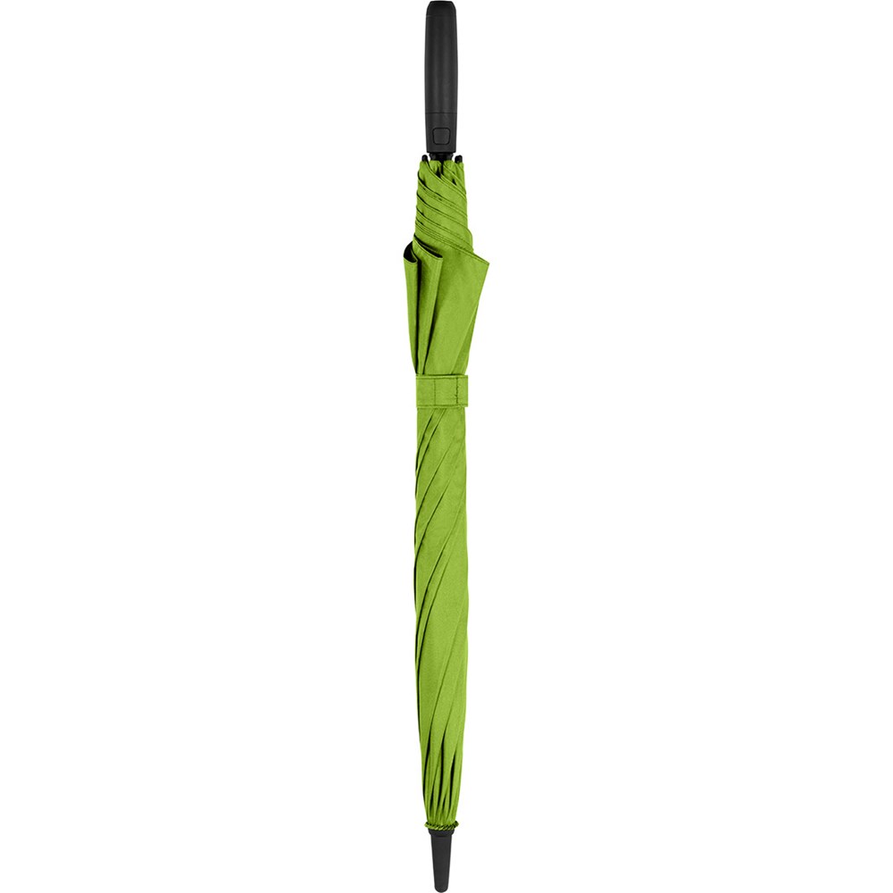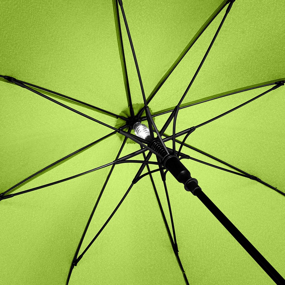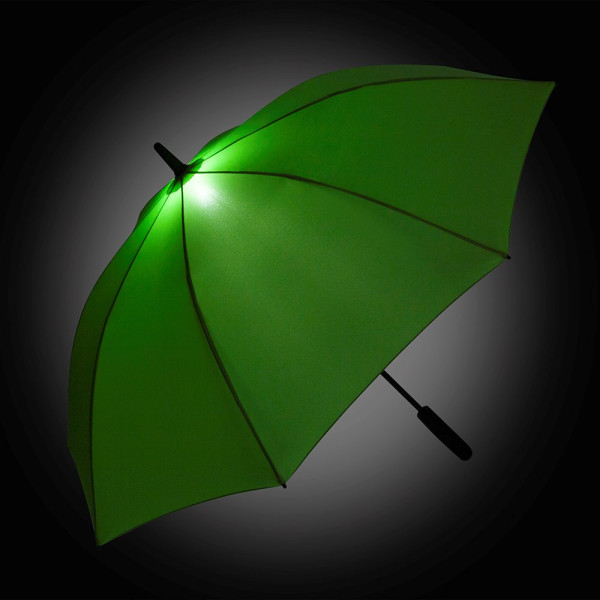 Attractive automatic umbrella in medium size with interior LED light Convenient automatic function for quick opening, high-quality Windproof PLUS system for maximum frame flexibility in stormy conditions, flexible fibreglass ribs, Soft-Feel handle with integrated push button, button to turn off the light and promotional labelling option, higher corrosion protection due to black galvanised steel shaft, WEEE reg. no. DE 14360689, Batteries (3 x AAA) included in the scope of deliver.