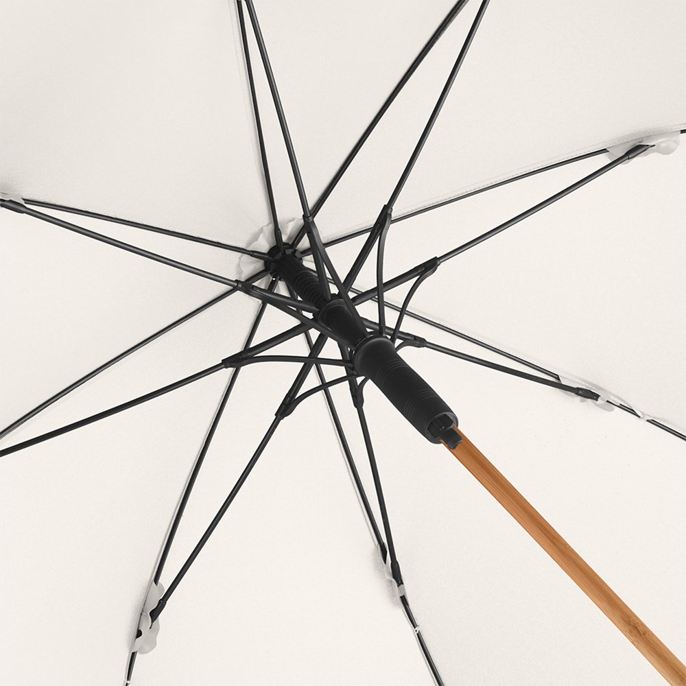 Sustainable automatic regular umbrella in medium size with bamboo parts and a cover made of recycled plastics Convenient automatic function for quick opening, high-quality Windproof PLUS system for maximum frame flexibility in stormy conditions, flexible fibreglass ribs, lightweight bamboo shaft, polyester ponge cover material made of recycled plastics, with waterSAVE® label on the closing strap, bamboo tips, straight bamboo handle with black push-button and promotional labelling option. Also available as mini umbrella (art. 5429).