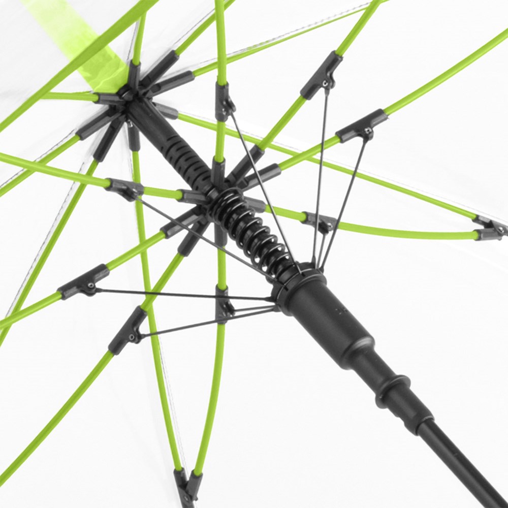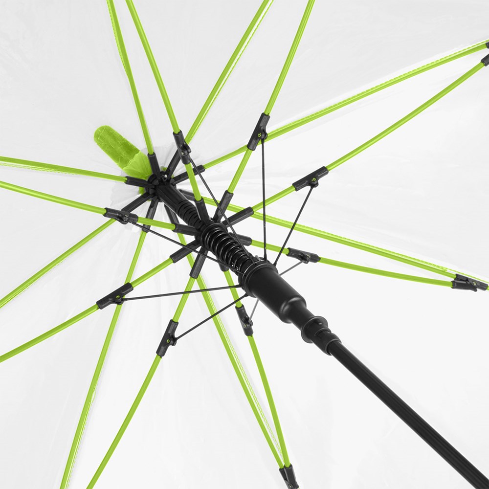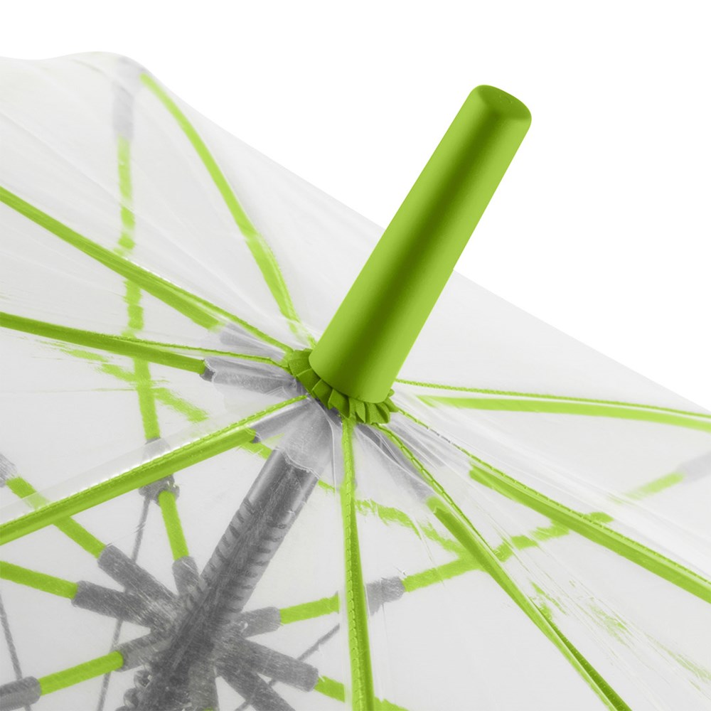 Attractive automatic regular umbrella with transparent cover and coloured details Convenient automatic function for quick opening, high-quality Windproof PLUS system for maximum frame flexibility in stormy conditions, flexible fibreglass ribs, colour-coordinated design elements, comfortable Soft-Touch crook handle with integrated push-button and promotional labelling option, higher corrosion protection due to galvanized steel shaft