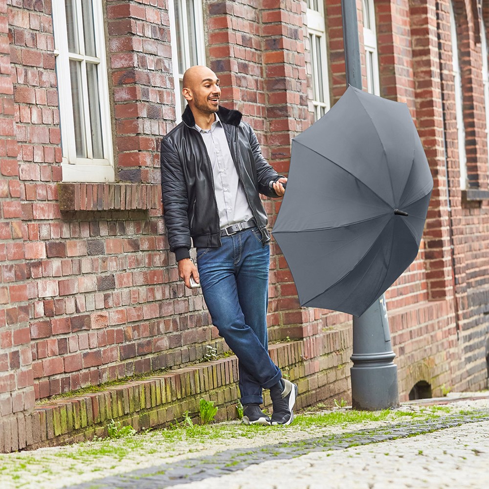 Extraordinary automatic umbrella in medium size for replaying sound logos Convenient automatic function for quick opening, high-quality Windproof PLUS system for maximum frame flexibility in stormy conditions, flexible fibreglass ribs, two-coloured comfortable Soft-Feel handle with integrated push-button, speaker and promotional labelling option, higher corrosion protection due to galvanized steel shaft, Batteries (2 x AAA) included in the scope of delivery.