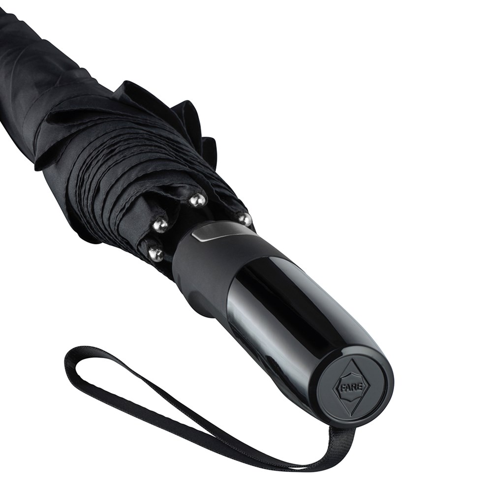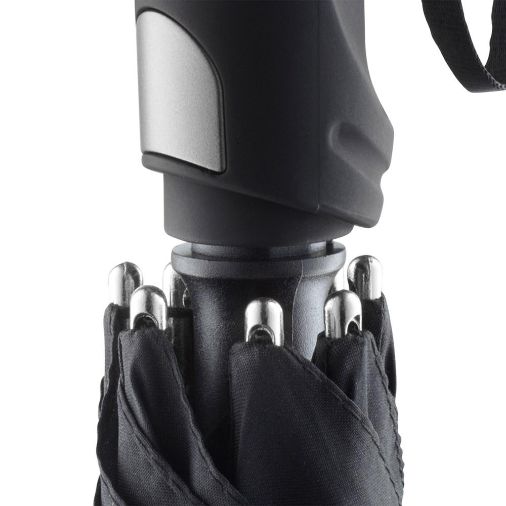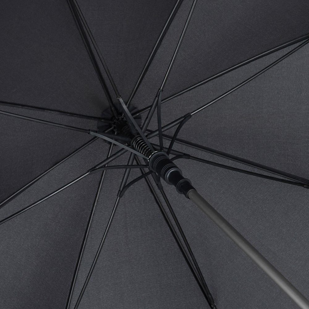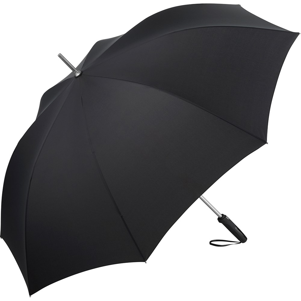 Classy automatic golf umbrella for two peolple with metallic coloured details Convenient automatic function for quick opening, high-quality Windproof PLUS system for maximum frame flexibility in stormy conditions, flexible fibreglass ribs, aluminium shaft with dull metallic colour, matching metal tips, closing strap with noticeable metal press button, matt / shiny contrasting Soft-Feel handle with integrated push-button and promotional labelling option