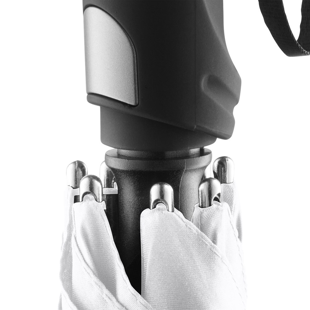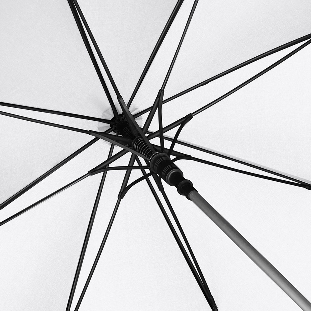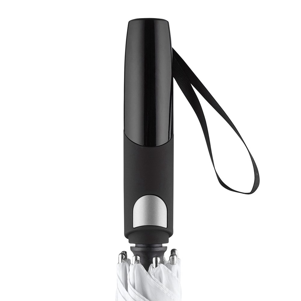 Classy automatic golf umbrella for two peolple with metallic coloured details Convenient automatic function for quick opening, high-quality Windproof PLUS system for maximum frame flexibility in stormy conditions, flexible fibreglass ribs, aluminium shaft with dull metallic colour, matching metal tips, closing strap with noticeable metal press button, matt / shiny contrasting Soft-Feel handle with integrated push-button and promotional labelling option