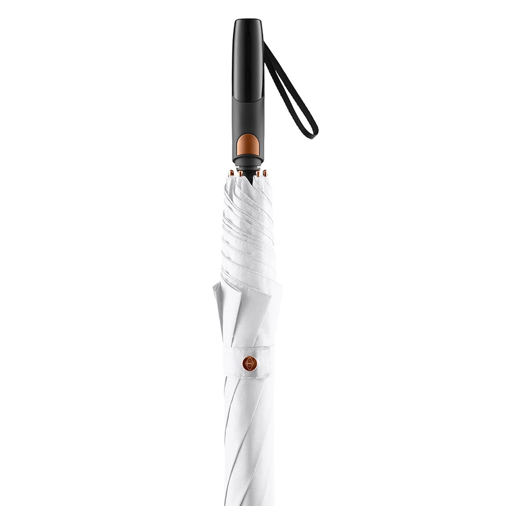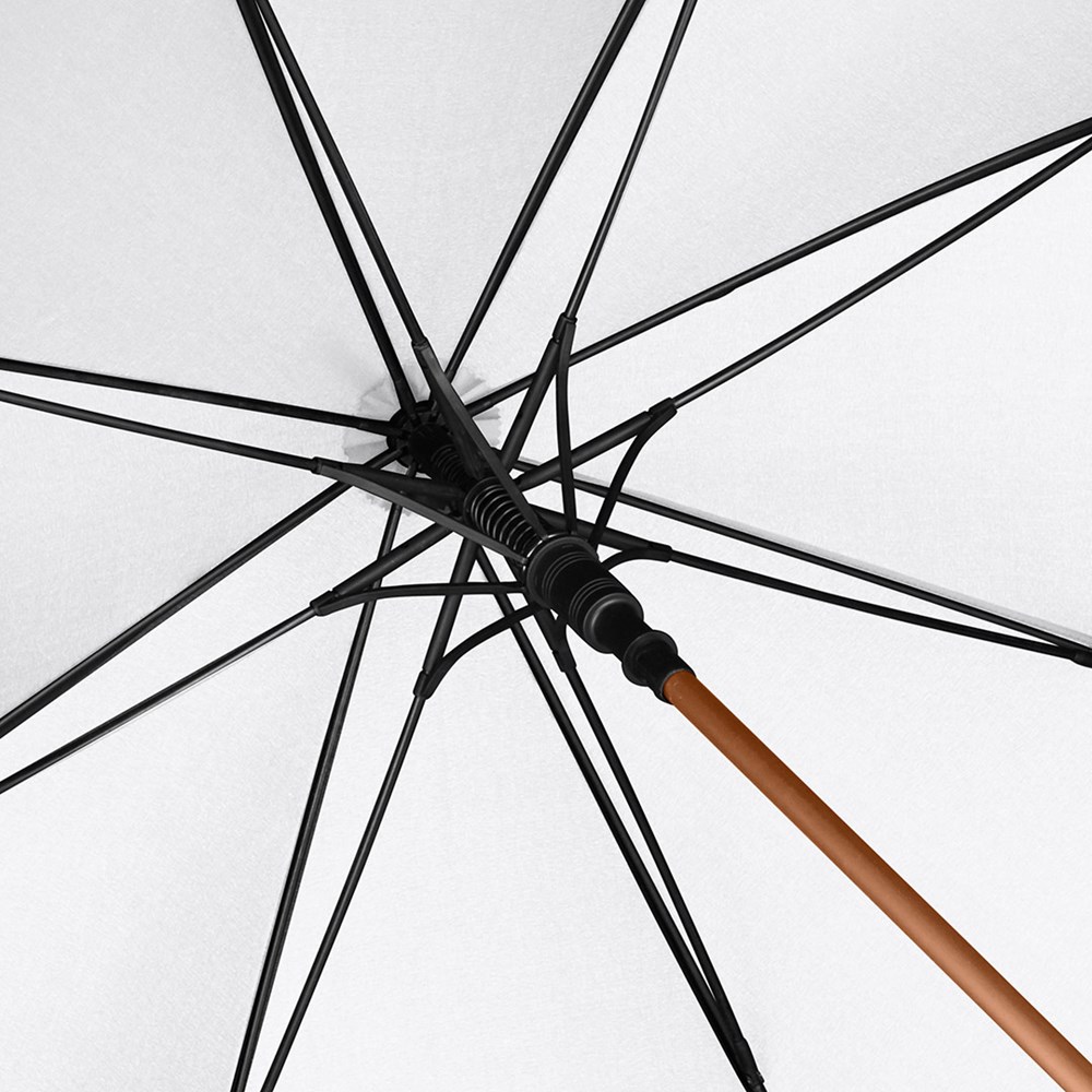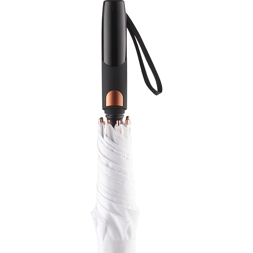 Classy automatic golf umbrella for two peolple with metallic coloured details Convenient automatic function for quick opening, high-quality Windproof PLUS system for maximum frame flexibility in stormy conditions, flexible fibreglass ribs, aluminium shaft with dull metallic colour, matching metal tips, closing strap with noticeable metal press button, matt / shiny contrasting Soft-Feel handle with integrated push-button and promotional labelling option