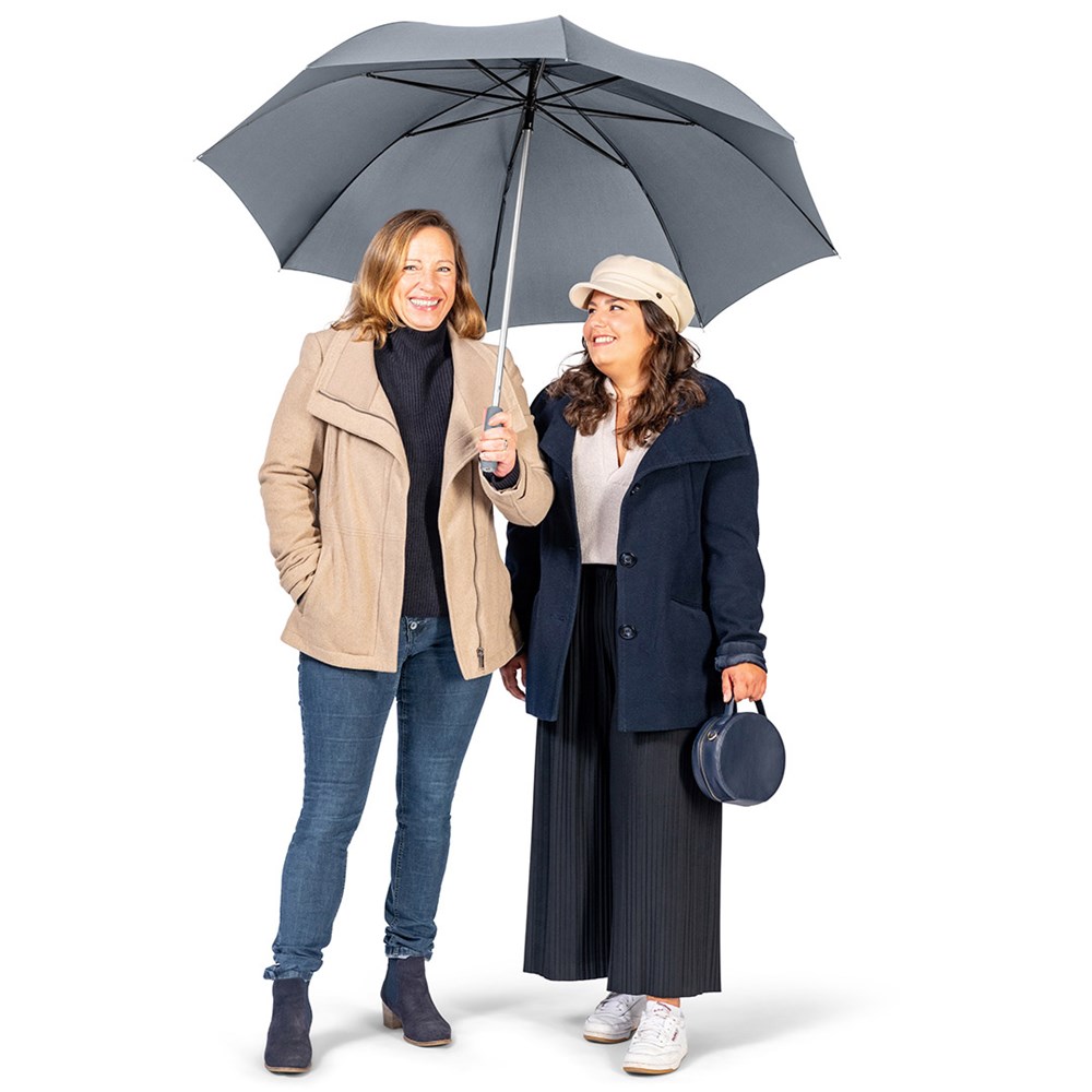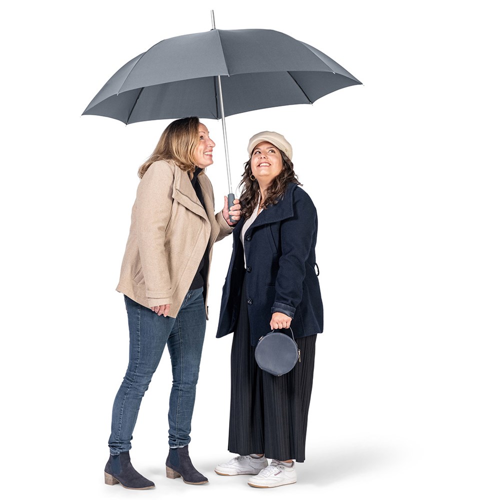 Stylish automatic golf umbrella for two people with colour co-ordinated handle and cover Convenient automatic function for quick opening, high-quality Windproof PLUS system for maximum frame flexibility in stormy conditions, flexible fibreglass ribs, lightweight but sturdy aluminium frame, attractive Soft-Touch handle with silver push-button and promotional labelling option, large, accommodating diameter. Also available as mini umbrella (art. 5565, 5460) and regular umbrella (art. 7560).