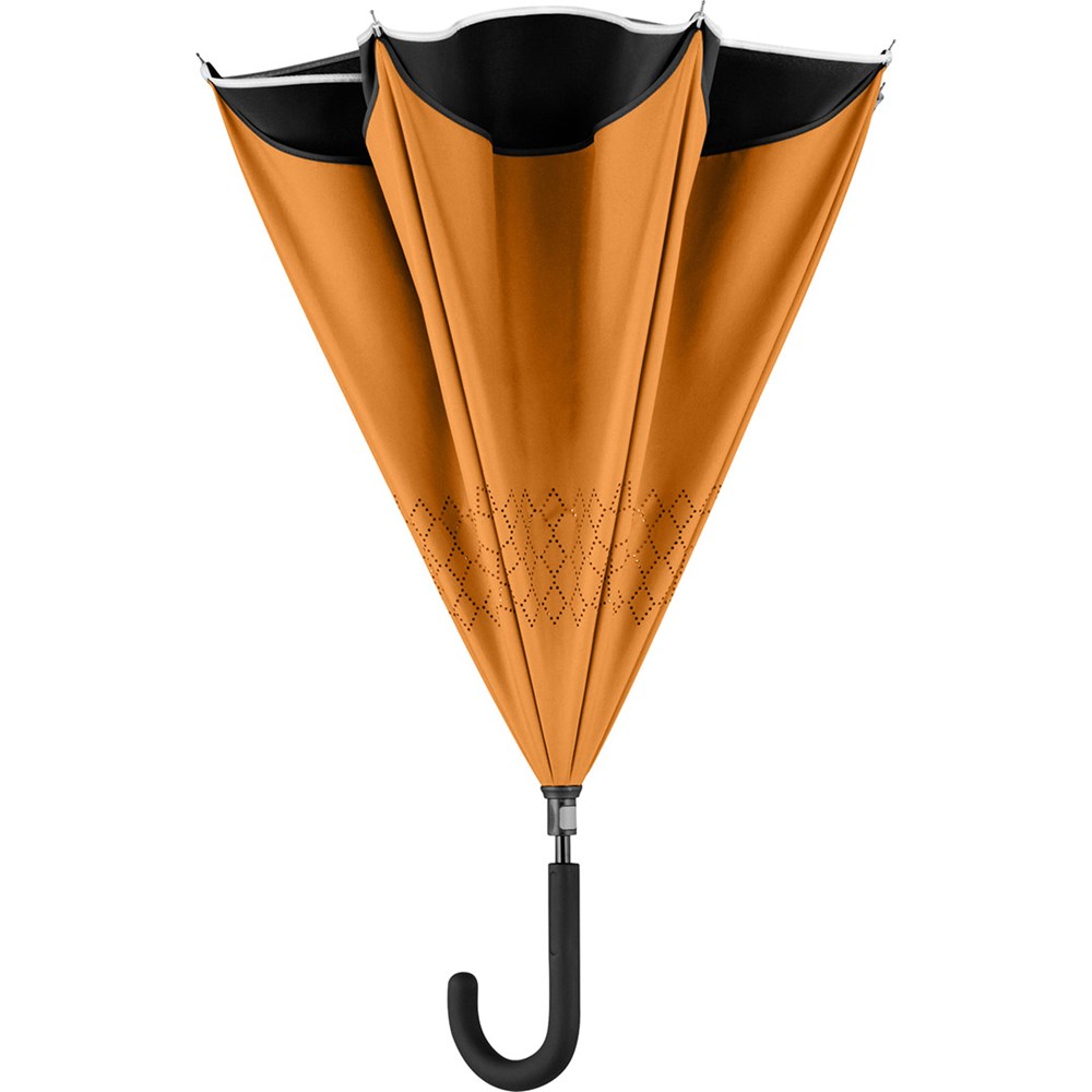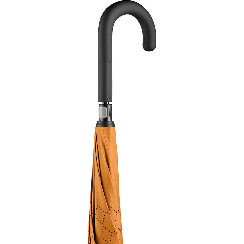 Trendy regular umbrella with reverse opening and closing mechanism Easy to handle thanks to sliding safety runner, high-quality Windproof PLUS system for maximum frame flexibility in stormy conditions, fibreglass frame opening from the inside out, flexible fibreglass ribs, double cover with lasered ventilation pattern to avoid the build-up of air, cover with trendy reflective piping in silver, soft-touch crook handle with promotional labelling option. Also available as mini umbrella (art. 5415).