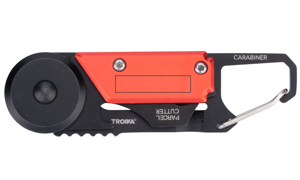 Mini tool with 5 functions, parcel cutter, carabiner, small saw blade, slotted screwdriver, bottle opener, 420 stainless steel, aluminium, black/red