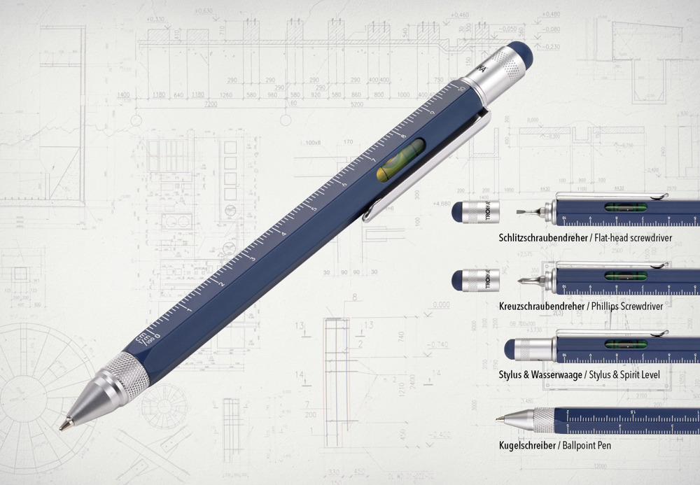 Multitasking ballpoint pen, centimetre/inch ruler, 1:20 m/1:50 m scale, spirit level,... more