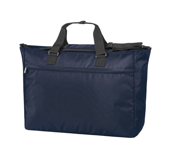 Modern, lightly padded weekender; rPET outer material; large main compartment with 2-way zip; zipped front pocket; flat zipped compartment inside; adjustable shoulder strap on both sides with sewn shoulder pad; handles with press stud cuff