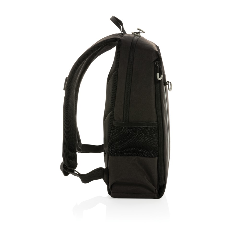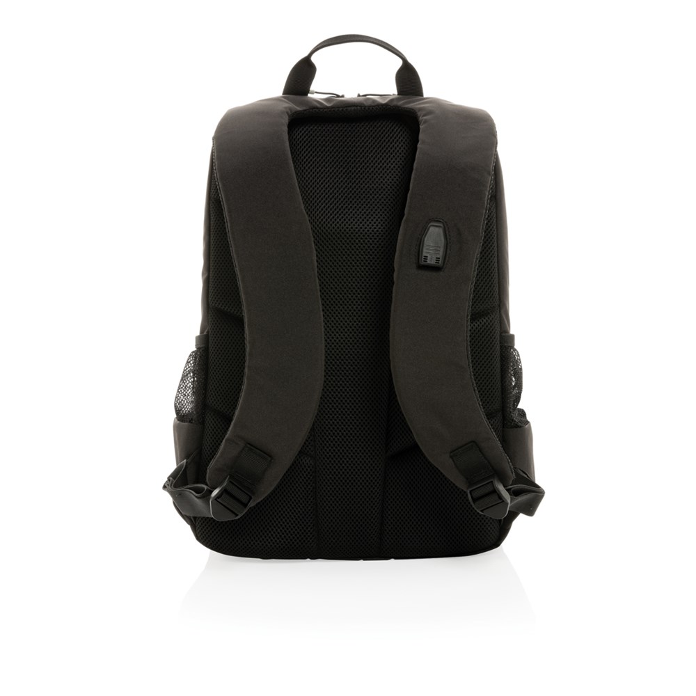 The Lima is a simple, practical and durable everyday backpack with 2 side pockets for water bottles or your umbrella. Convenient USB A output on the strap. Padded 15.6" compartment for laptop computer as well as several spacious compartments and RFID protected sleeve pockets. With AWARE™ tracer that validates the genuine use of recycled materials. Each backpack has reused 32.8 bottles. 2% of proceeds of each Impact product sold will be donated to Water.org. Composition 100% recycled polyester. Registered design®. NFC (13.56 MHz) Blocking.