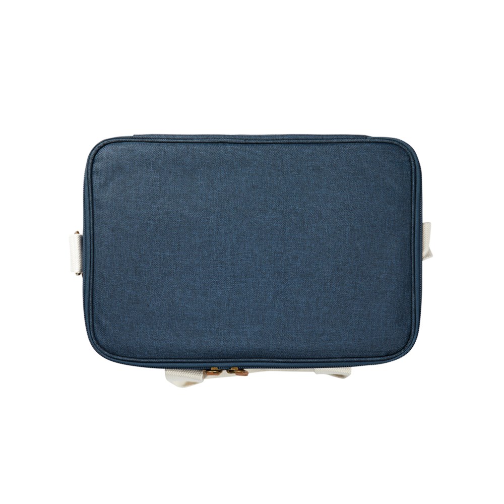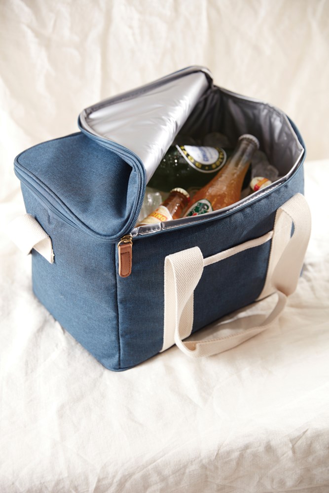 The ultimate cooler basket, mottled tone by tone with details in imitation leather and cotton. There is also a small compartment on the outside of the cooler bag, providing space for other items as well. The thick PEVA padding ensures that the cold is retained for a long time. It is also easy to clean and dry after use. Thanks to the adjustable shoulder strap and the double handle, you have several ways to carry the cooler basket.