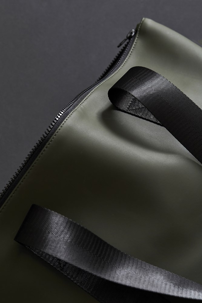 A small, sleek bag made of a lightweight, water-resistant nubuck PU fabric with a stylish matte exterior and a lightweight synthetic fabric interior. The main compartment closes with a zipper. Sturdy handles so you can fill the bag properly.