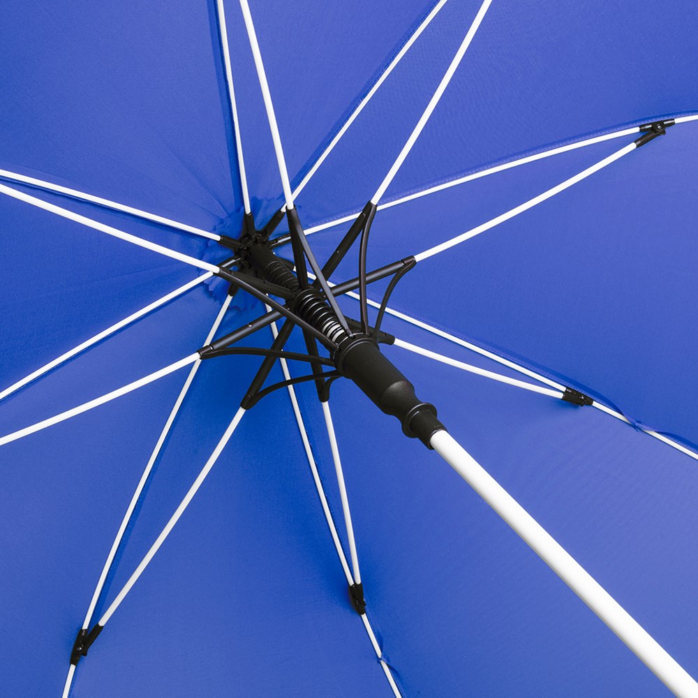 Stylish automatic umbrella in medium size with white shaft, ribs and plastic tips Convenient automatic function for quick opening, high-quality Windproof PLUS system for maximum frame flexibility in stormy conditions, flexible fibreglass ribs in white, stable steel shaft with white plastic sleeve, polyester pongee cover material made of recycled plastics, white plastic tips, shapely soft feel handle with integrated push button and promotional labelling option