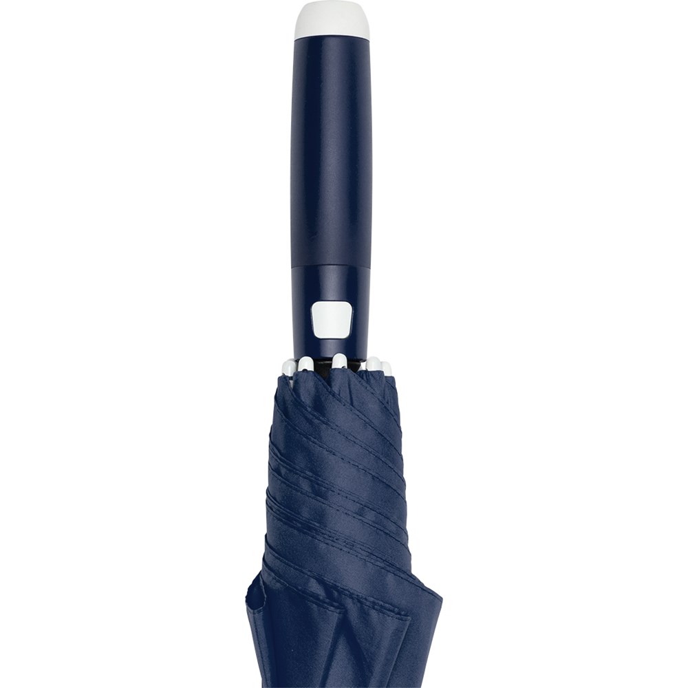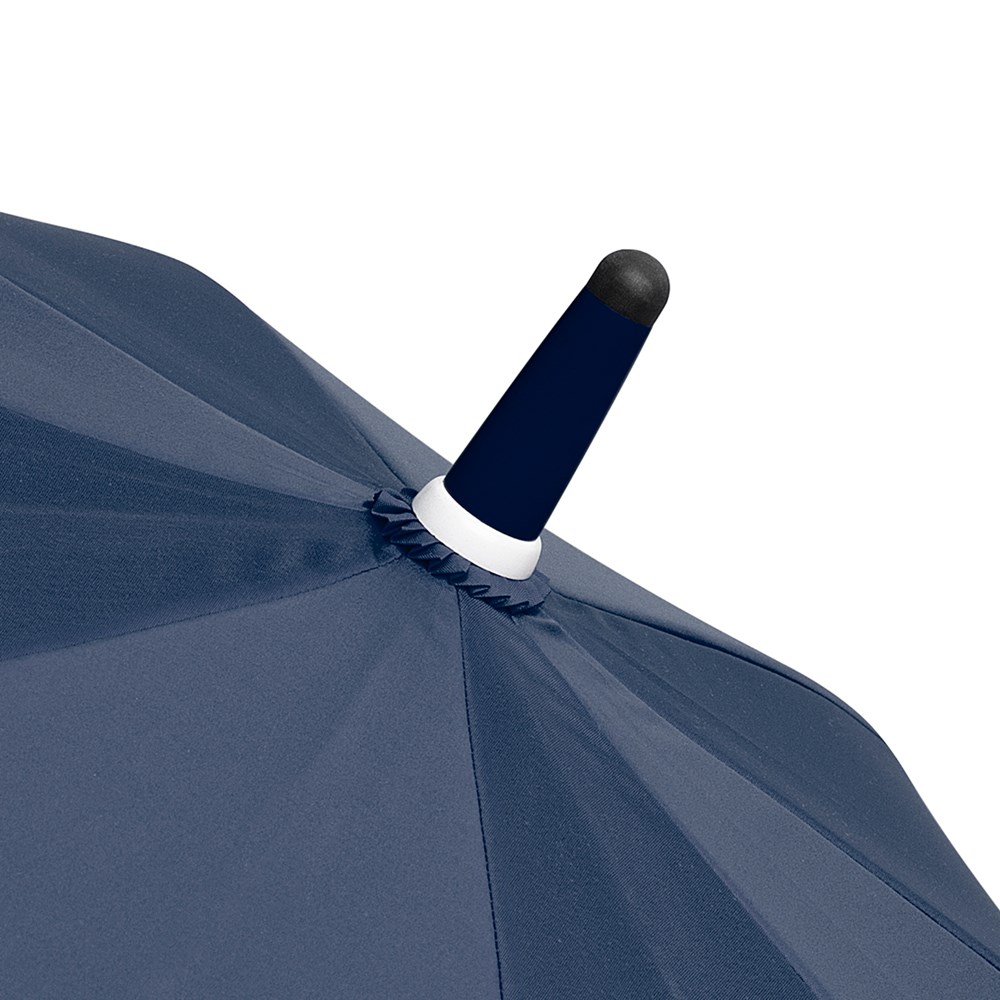 Stylish automatic umbrella in medium size with white shaft, ribs and plastic tips Convenient automatic function for quick opening, high-quality Windproof PLUS system for maximum frame flexibility in stormy conditions, flexible fibreglass ribs in white, stable steel shaft with white plastic sleeve, polyester pongee cover material made of recycled plastics, white plastic tips, shapely soft feel handle with integrated push button and promotional labelling option