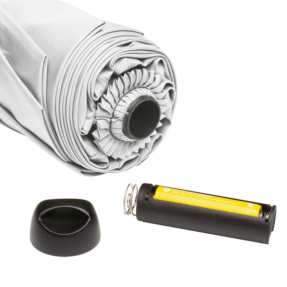 Effective pocket umbrella with interior LED lighting and hanger function Simple and safe handling by safety runner, high-quality Windproof PLUS system for maximum frame flexibility in stronger gusts of wind, soft feel handle with removable carrying strap in the colour of the cover and with promotional labelling option, top with hanger function for carrying strap for decorative purposes, easy on/off switching of the light on the safety runner, WEEE reg. no. DE 14360689, batt. reg. no. DE 52803080, Batteries (1 x AAA) included in the scope of delivery.