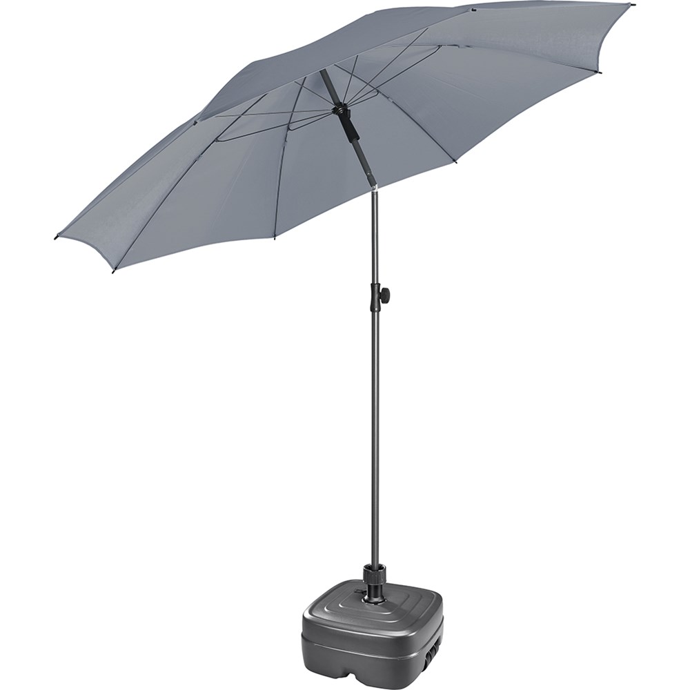 Modern parasol with frame in a titanium finish and tilt mechanism Simple handling with safety runner, very solid fibreglass ribs, two-piece and progressively height-adjustable shaft with with tilt mechanism to angle the umbrella, shaft in an elegant titanium finish, lower shaft approx. 120 cm long and twist lock to fix securely, convenient carrying case, high-quality cover with a grammage of approx. 200 g/m² and UPF 50+ sun protection factor, excluding parasol base (Art. 8920 or Art. 8905) / ground spike (Art. 8939)
