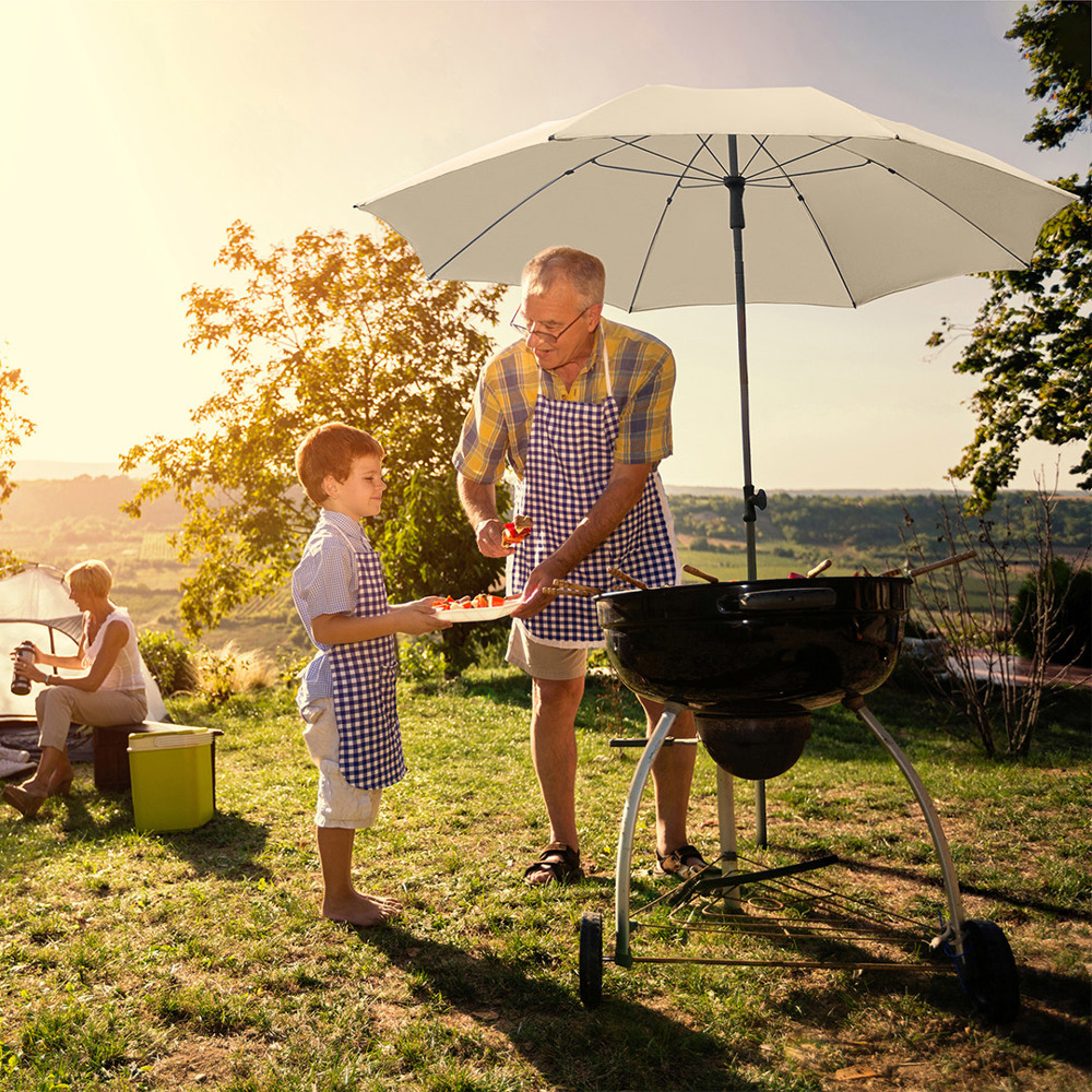 Modern parasol with frame in a titanium finish and tilt mechanism Simple handling with safety runner, very solid fibreglass ribs, two-piece and progressively height-adjustable shaft with with tilt mechanism to angle the umbrella, shaft in an elegant titanium finish, lower shaft approx. 125 cm long and twist lock to fix securely, convenient carrying case, high-quality cover with a grammage of approx. 200 g/m² and UPF 50+ sun protection factor, overlapping ventilation cover to regulate pressure in stronger gusts, excluding parasol base (art. 8920)