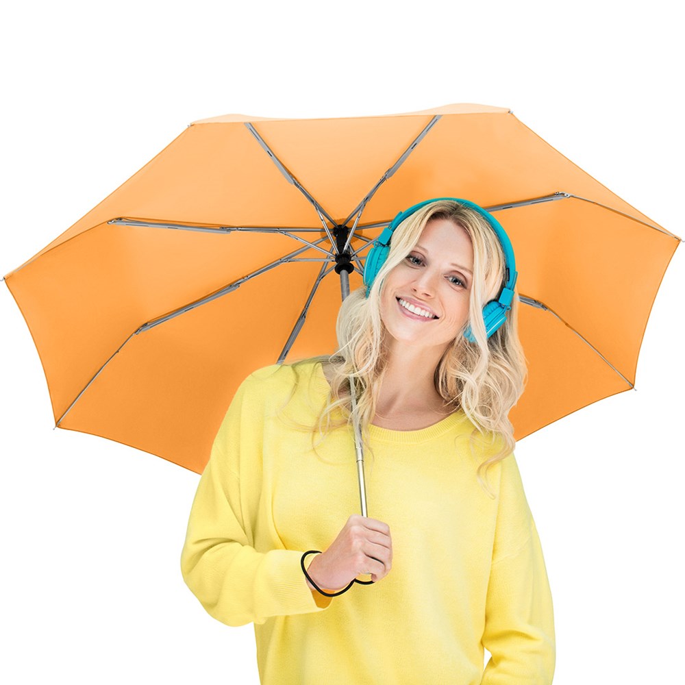 Trendy automatic open/close mini pocket umbrella in consistently uniform colouring Convenient automatic open/close function for quick opening and closing, high-quality Windproof PLUS system for maximum frame flexibility in stormy conditions, some colours are also available with waterSAVE® cover material - these are marked with the waterSAVE® label on the closing strap, chromed steel shaft, Soft-Touch handle in colour matching cover with silver push-button, elastic loop and promotional labelling option, sleeve with black piping. Also available as another mini pocket umbrella (art. 5565), as regular umbrella (art. 7560) and golf umbrella (art. 7580).