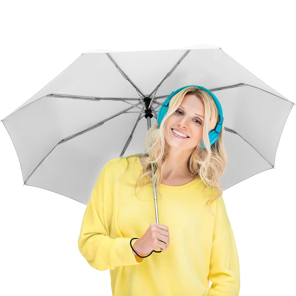 Trendy automatic open/close mini pocket umbrella in consistently uniform colouring Convenient automatic open/close function for quick opening and closing, high-quality Windproof PLUS system for maximum frame flexibility in stormy conditions, some colours are also available with waterSAVE® cover material - these are marked with the waterSAVE® label on the closing strap, chromed steel shaft, Soft-Touch handle in colour matching cover with silver push-button, elastic loop and promotional labelling option, sleeve with black piping. Also available as another mini pocket umbrella (art. 5565), as regular umbrella (art. 7560) and golf umbrella (art. 7580).