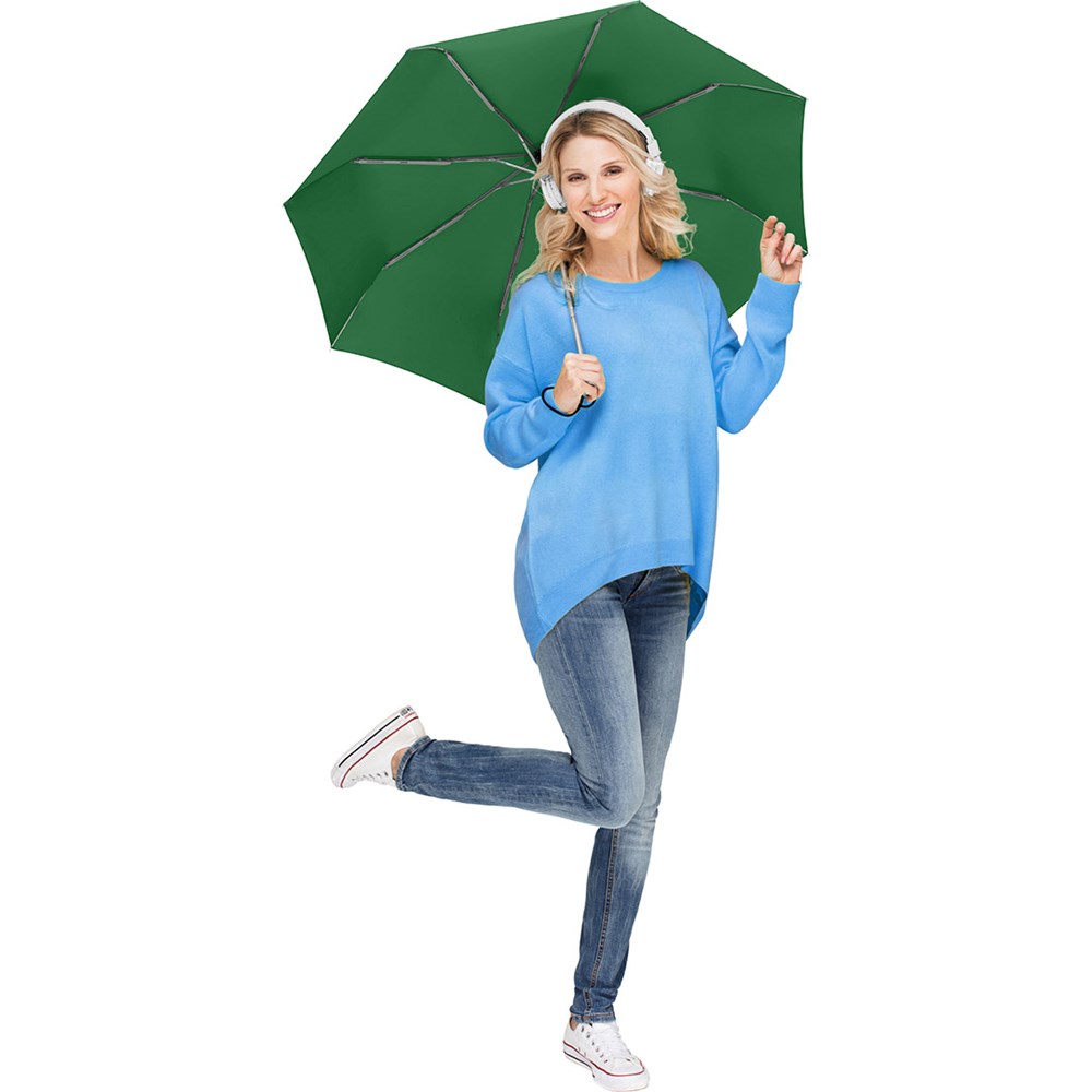 Trendy automatic open/close mini pocket umbrella in consistently uniform colouring Convenient automatic open/close function for quick opening and closing, high-quality Windproof PLUS system for maximum frame flexibility in stormy conditions, some colours are also available with waterSAVE® cover material - these are marked with the waterSAVE® label on the closing strap, chromed steel shaft, Soft-Touch handle in colour matching cover with silver push-button, elastic loop and promotional labelling option, sleeve with black piping. Also available as another mini pocket umbrella (art. 5565), as regular umbrella (art. 7560) and golf umbrella (art. 7580).