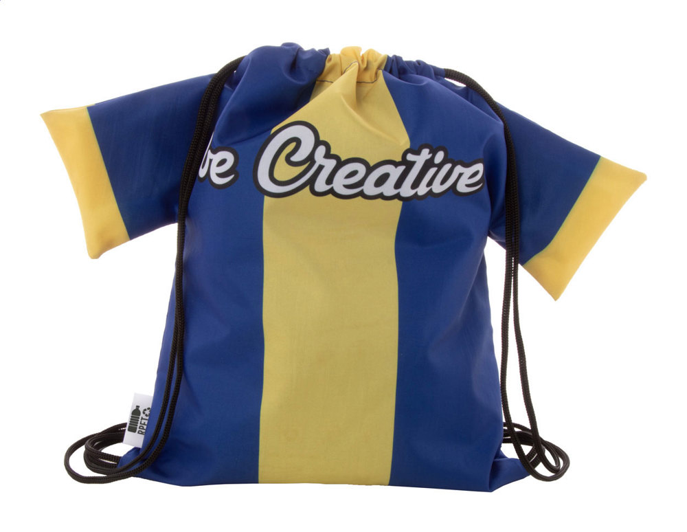 Custom made, T-shirt shaped drawstring bag for children with coloured strings, 190T RPET polyester. With all over sublimation printed graphics and distinctive RPET label. MOQ: 25 pcs.