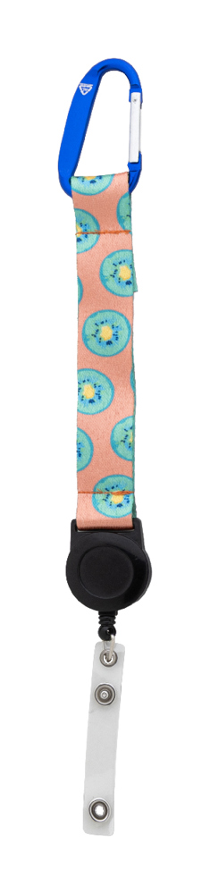 Custom made RPET polyester keyring with sublimation printed graphics on both sides. With inside RPET label, telescopic badge holder, aluminium carabiner and metal keyring. MOQ: 100 pcs.