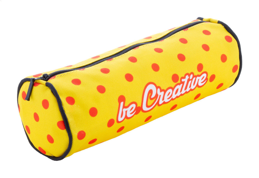 Custom made, round shaped zipped pen case in 600D RPET polyester. With all over sublimation printed graphics and distinctive RPET label. MOQ: 50 pcs.