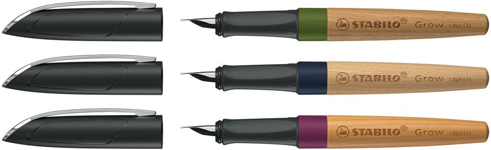 SUSTAINABILITY MEETS DESIGN. Fountain pen with barrel made from 100% FSC-certified wood and ergonomic grip zone. 3 different wood-and-colour combinations, unique as each wooden shaft has a distinct colour and grain. With royal-blue ink cartridge that can be replaced with standard cartridges and high-quality iridium-tipped steel nib. Also available in an individual packaging made from KraftPak in brown cardboard look.