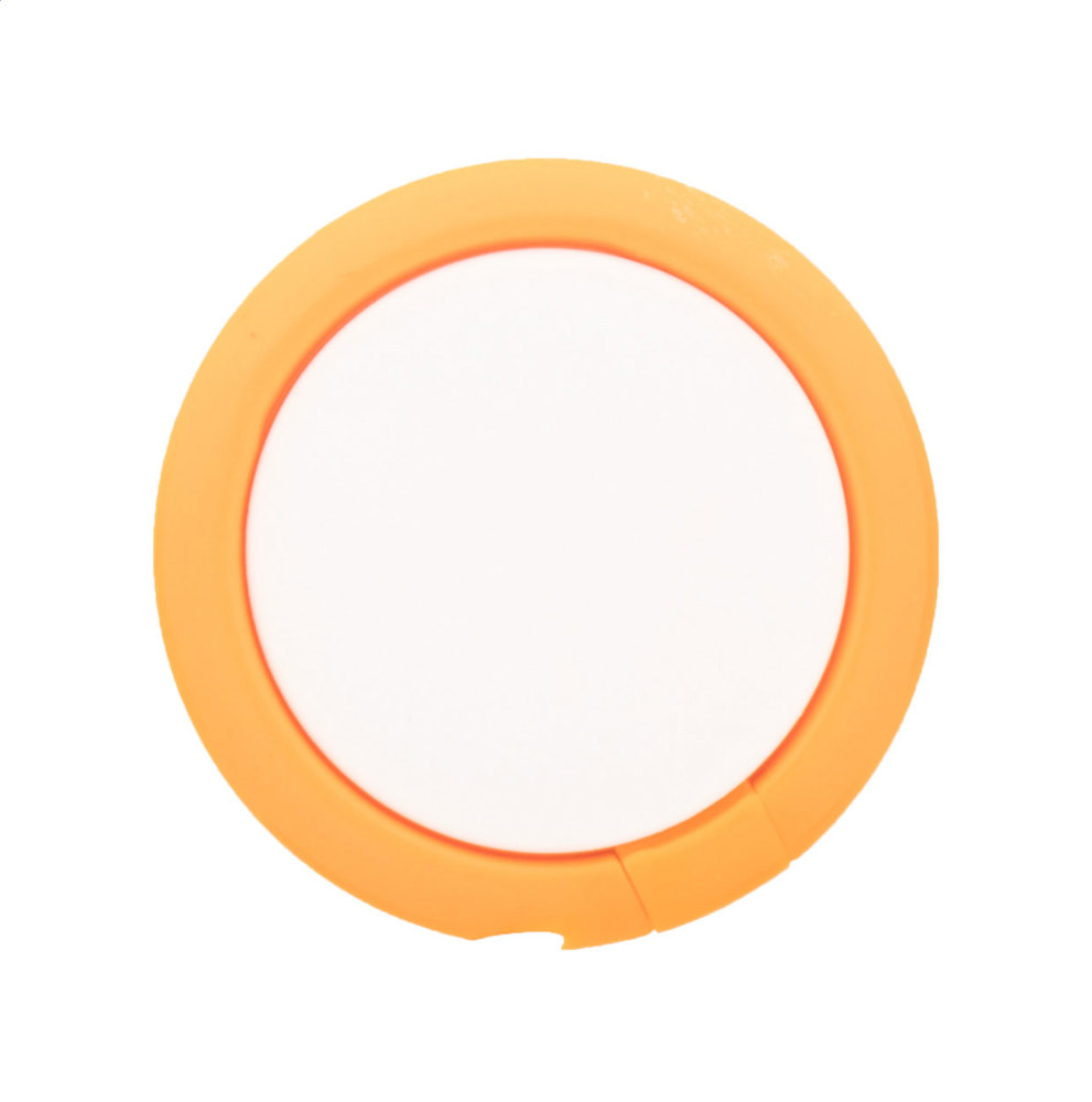 Round shaped, plastic mobile holder ring with self-adhesive base.