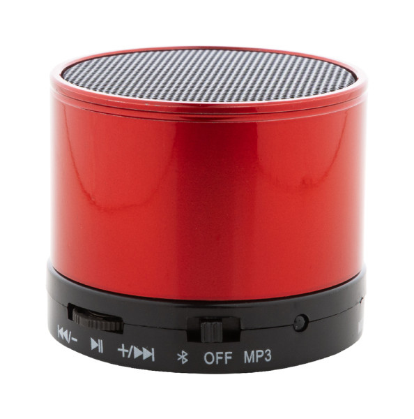 Wireless speaker with metal housing. With radio, MP3 player, hands-free call function and built-in rechargeable battery. Including USB charger and aux-in cable.