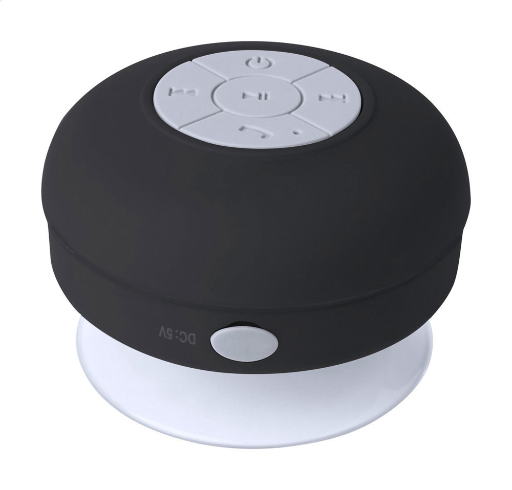 Wireless speaker with rubber-coated housing and large suction cup. With hands-free call function and built-in rechargeable battery. Including USB charger cable.