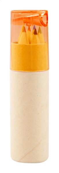 6 pc coloured pencil set in round cardboard case with plastic sharpener.