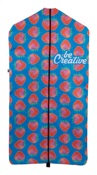 Custom made, zipped garment bag in 190T RPET polyester. With all over sublimation printed graphics and distinctive RPET label. MOQ: 25 pcs.