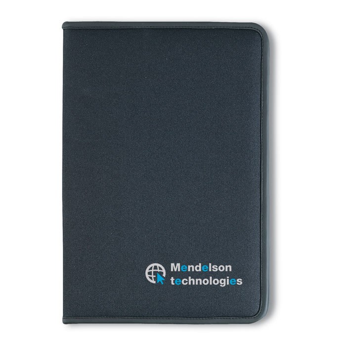 A4 conference folder. 600D polyester and 210T lining. Zipped. A4 20 lined recycled paper sheets notepad. 4 compartments. Card holer.