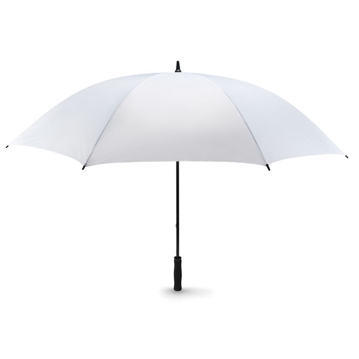 30 inch manual open windproof umbrella in 190T polyester with fiberglass shaft and ribs. Black plastic tips and top. Straight black EVA handle. Manual closure.