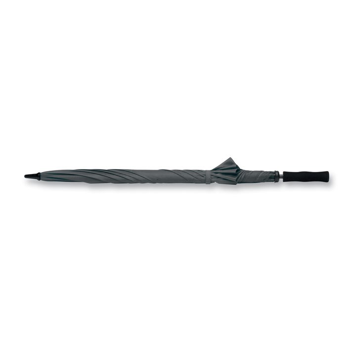 30 inch manual open windproof umbrella in 190T polyester with fiberglass shaft and ribs. Black plastic tips and top. Straight black EVA handle. Manual closure.