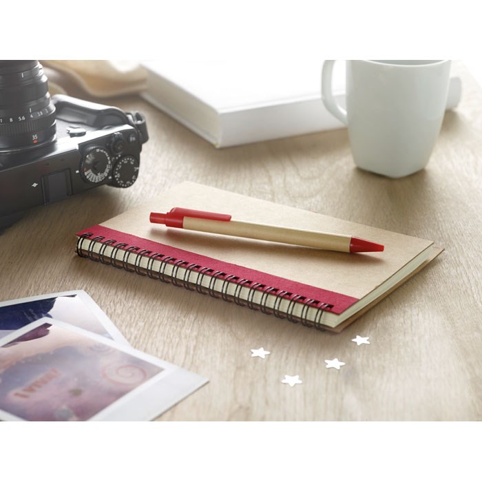 Recycled paper notebook with matching pen. Twin-wire. 140 plain recycled paper pages (70 sheets). Matching push button ball pen in recycled carton and biodegradable plastic. Blue ink. Matching elastic pen holder. FSC MIX CREDIT | P7.1 | FSC-C213206