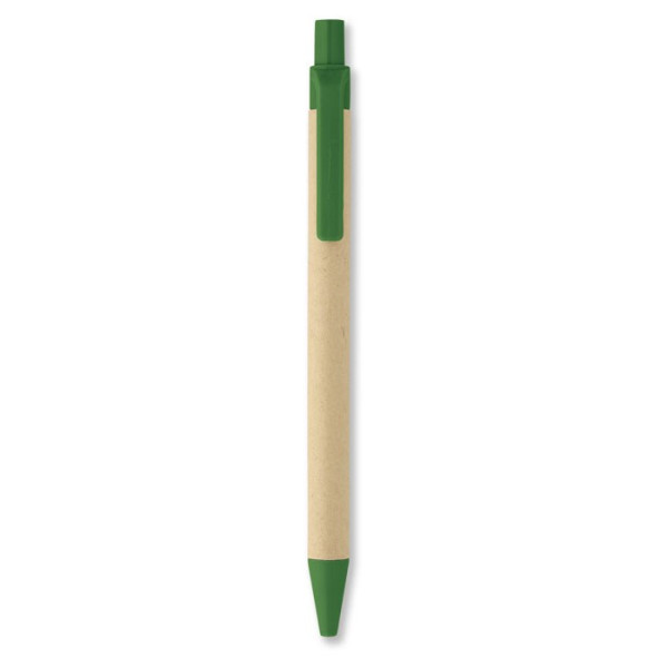 Push button ball pen with recycled paper barrel and PLA parts (in 100% biodegradable corn). Blue ink.