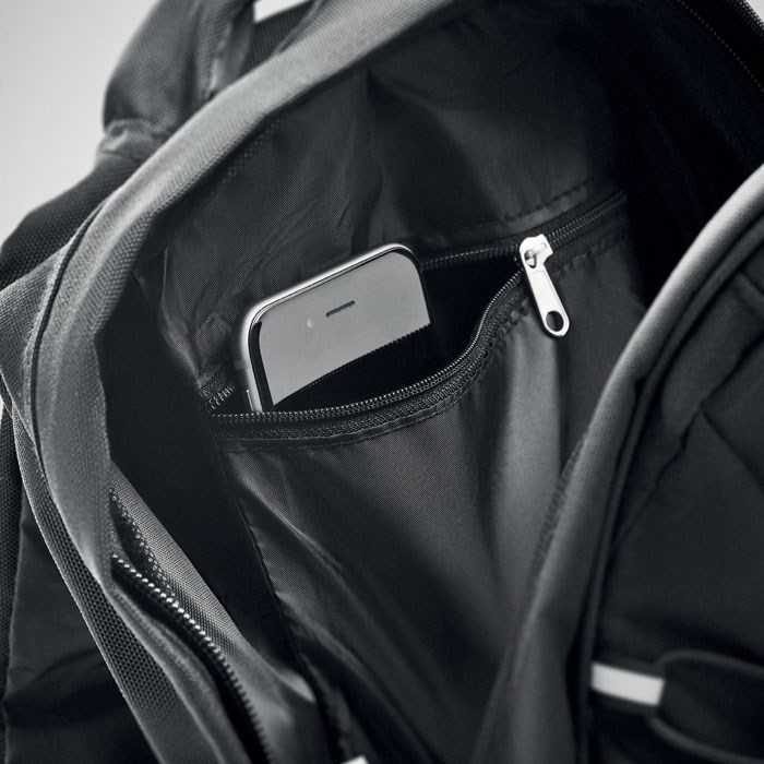 Backpack in 600D RPET with dark cords in front and reflective front panel feature. Mesh pockets... more