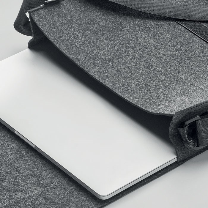 RPET felt messenger or laptop bag with hook and loop closure. Fits a 15 inch laptop.
